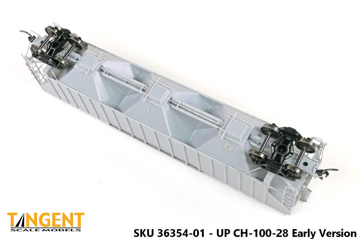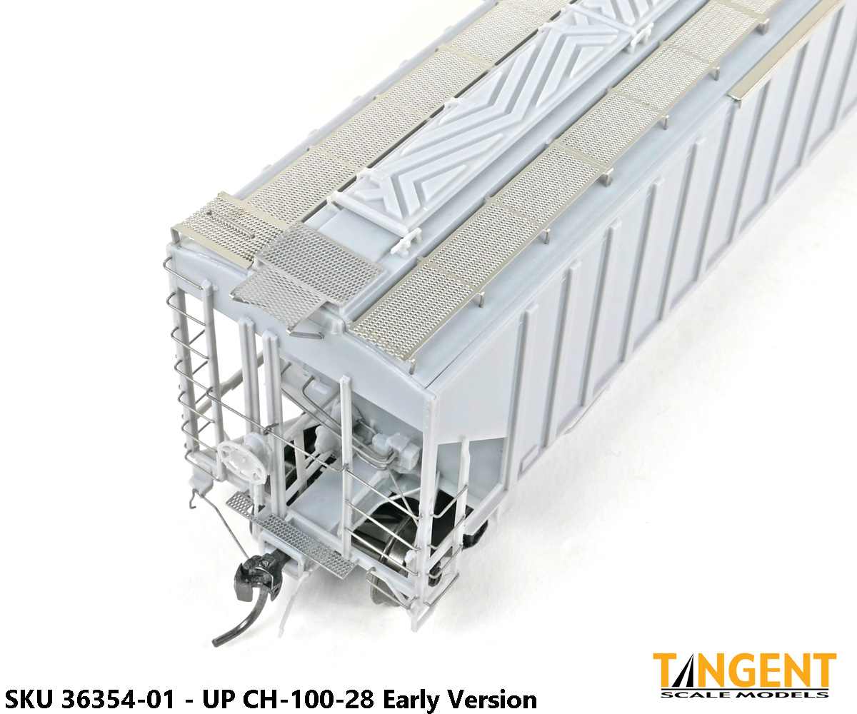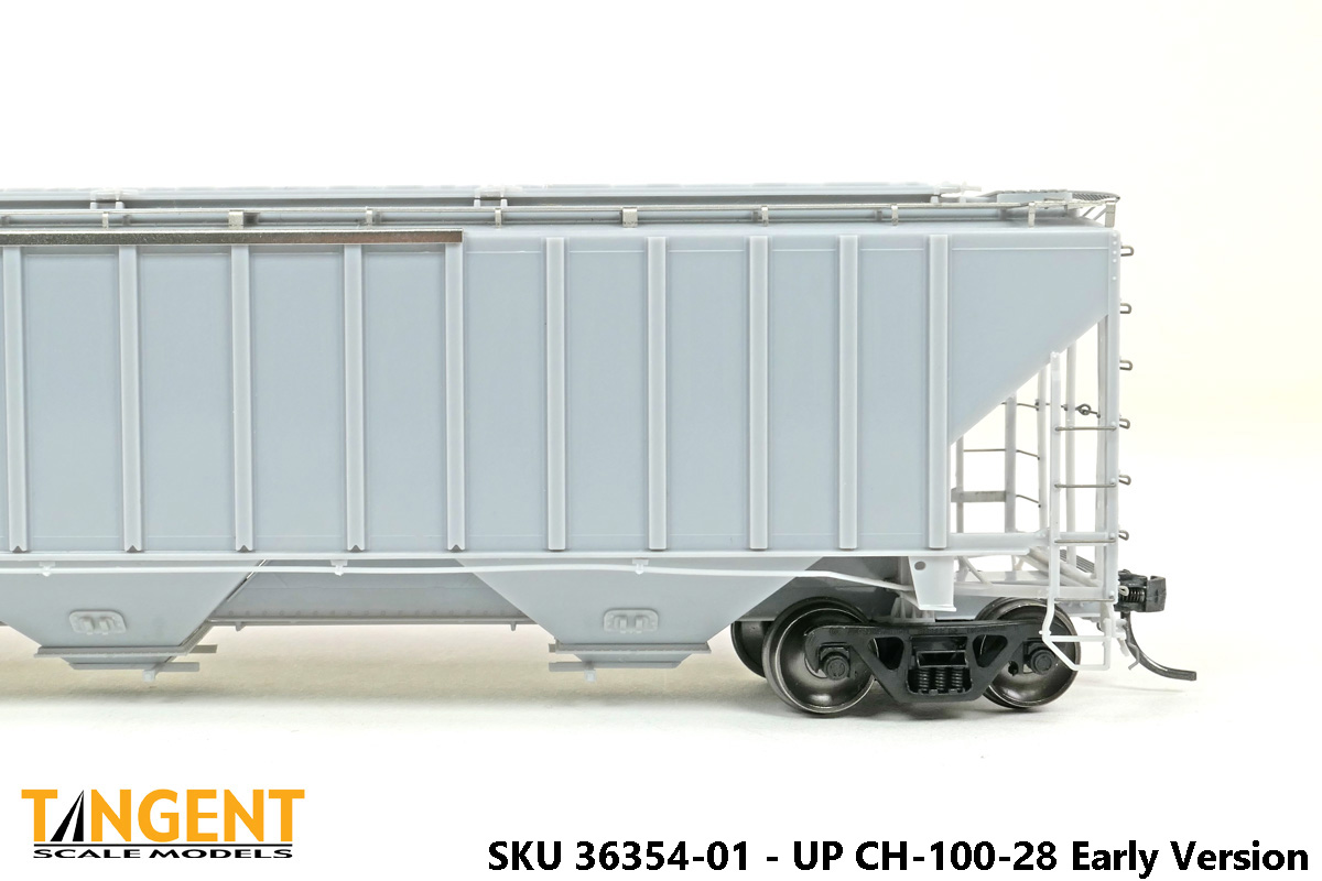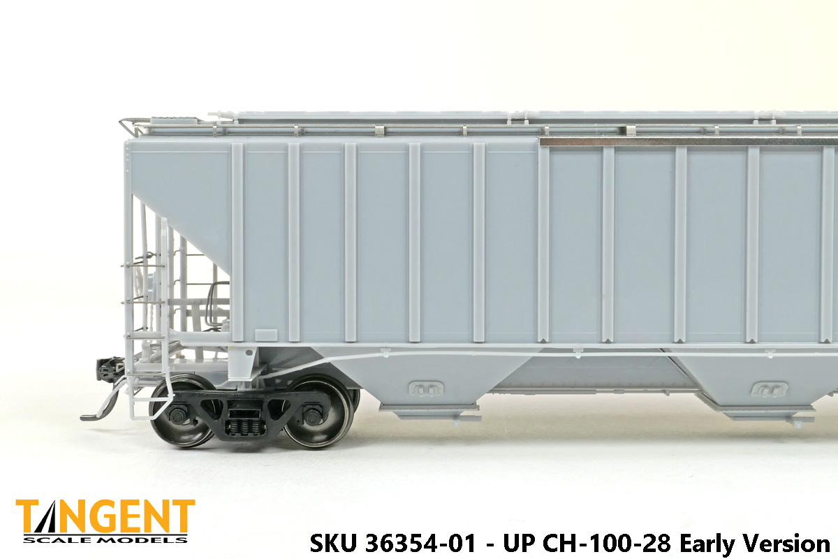 – Undecorated RTR Unpainted UP CH-100-28 Early Version continues our dedication to the modelers. We get it—sometimes you just want to paint your own car. We are modelers too, and we understand the need to continue to offer undecorated products without drama. This car is completely assembled and unpainted! This car has an accurate 1973 Pullman 4750 body with combination open-hole/closed-hole posts. Other details include UP-specific corner steps and bolted outlet bay gate flanges, Landreth roof hatch covers, Gypsum roof walkways/end crossover platforms, Universal power brake and brake wheel, and body-mounted brake hardware. Underneath, the models come equipped with Miner outlet gates and 100-ton Barber S-2 trucks with accurate “Hyatt” rotating caps. Assembled. Unpainted. Ready for finishing.