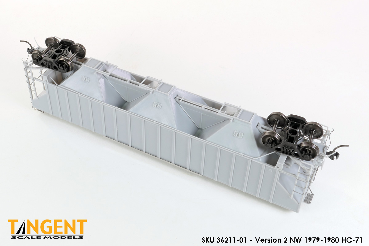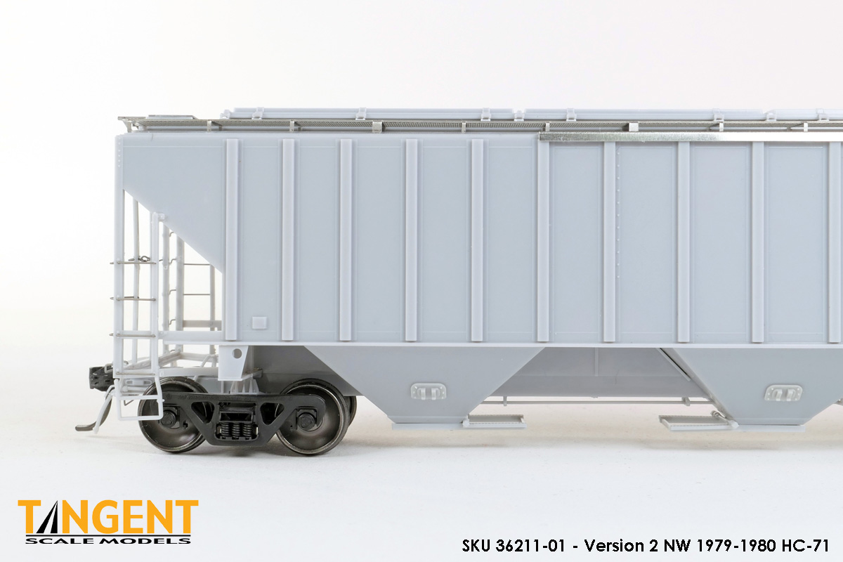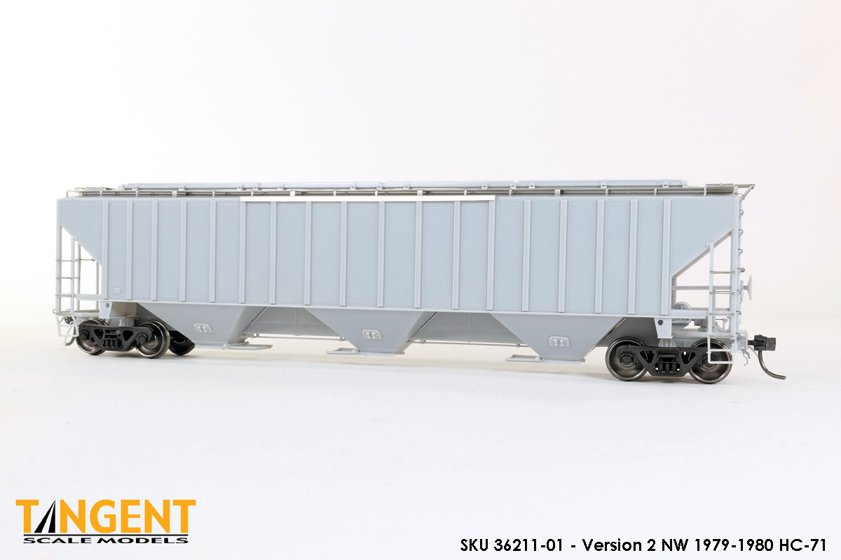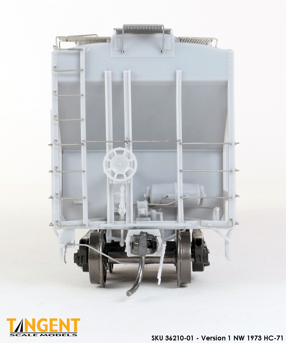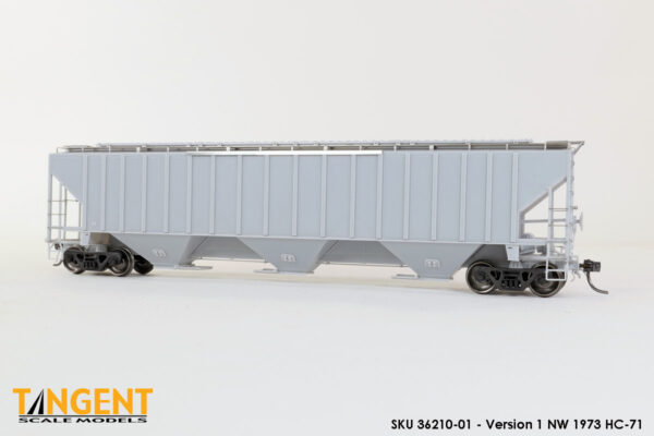 – Undecorated RTR Unpainted Version 1 NW 1973-1974 HC-71: This car is completely assembled and unpainted! It is based on the 1973/1974 HC-71 Roanoke group with ribbed roof hatches, slotted hole jacking pads above the bolsters, Ajax hand brake, Morton-style roof walkways and Keystone Portloc outlet gates. The model rides on Tangent’s unmatched 100-Ton Barber S-2 Roller Bearing Trucks with rotating Brenco-6 caps and 36” all-metal wheels. This model is ready for painting and lettering in an NW/NS prototype scheme or your own private road. Original NW series 177001-178000. SKU 36210-01