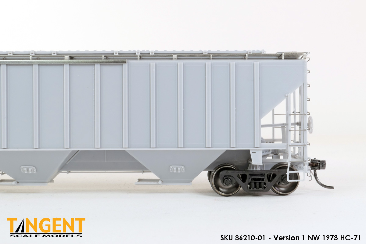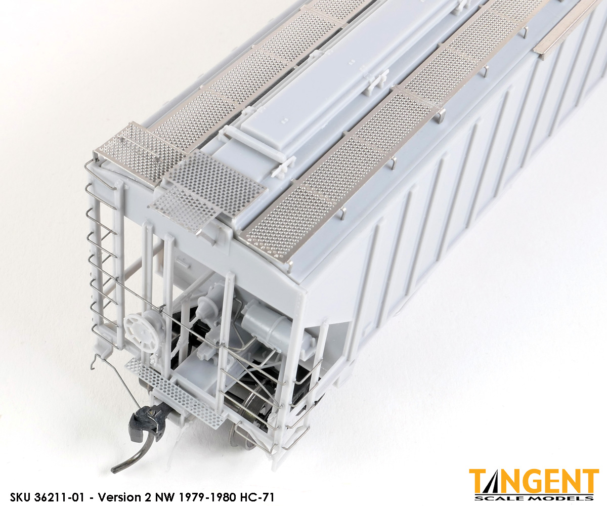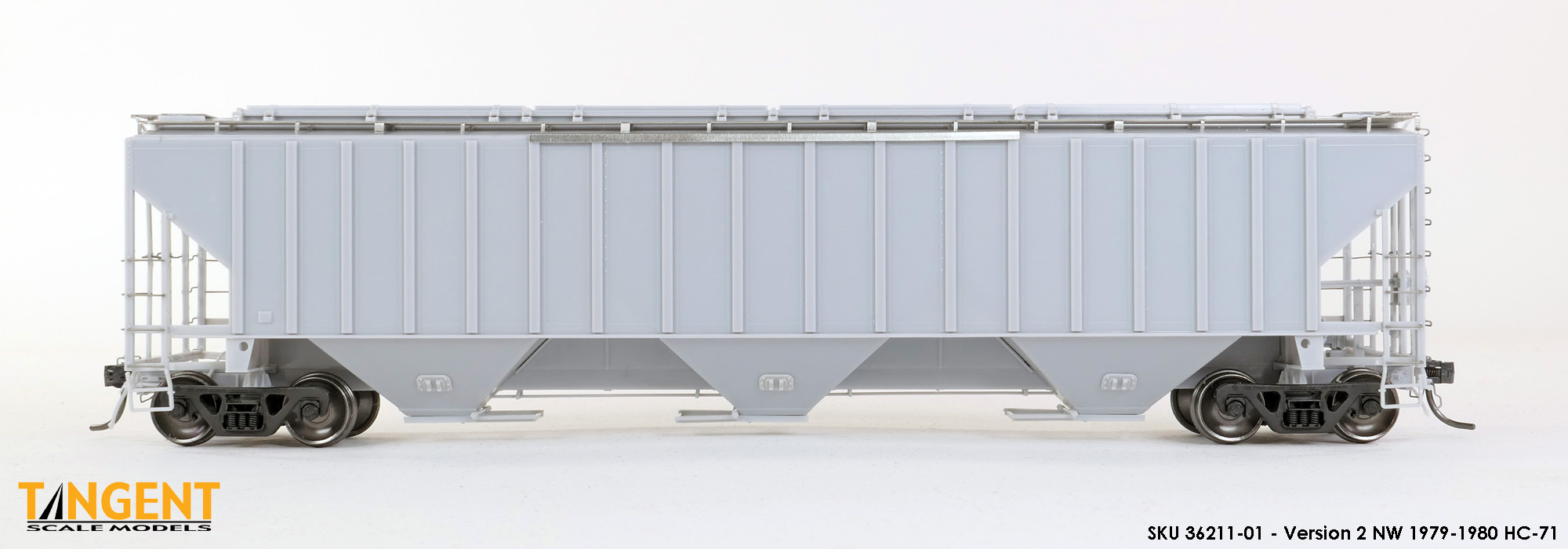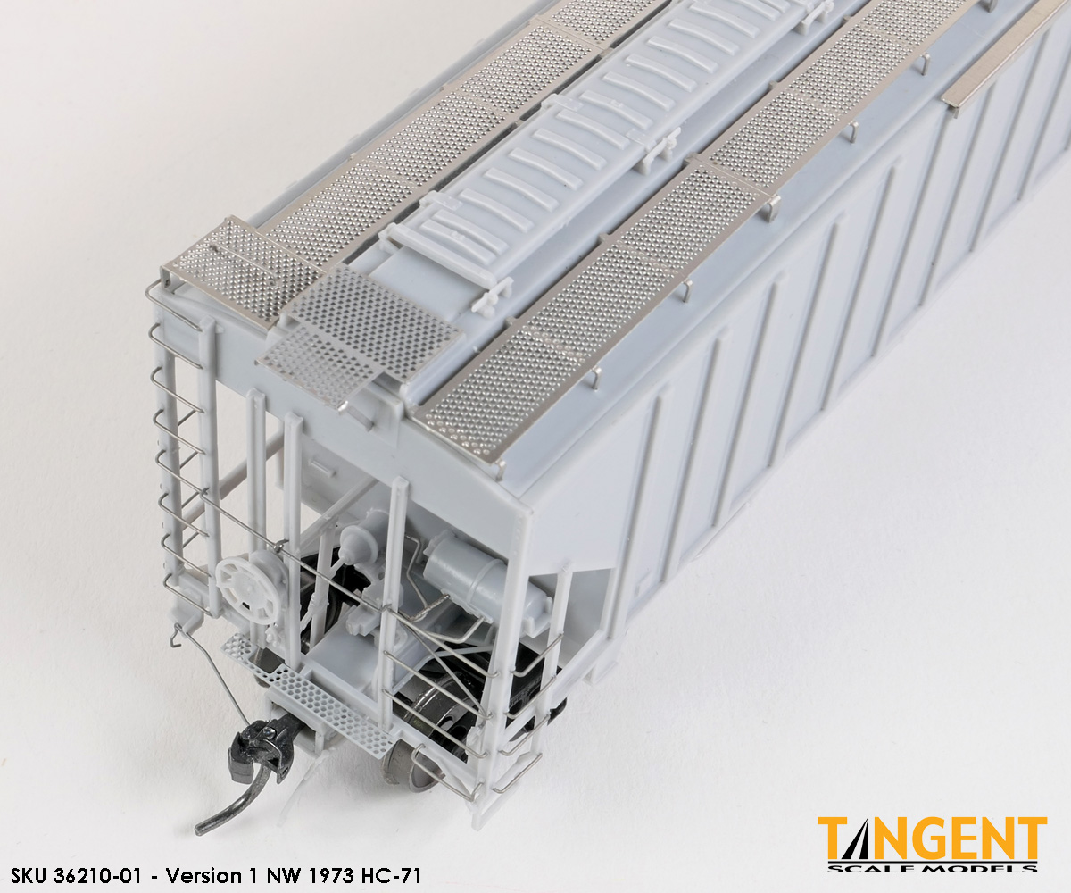 – Undecorated RTR Unpainted Version 1 NW 1973-1974 HC-71: This car is completely assembled and unpainted! It is based on the 1973/1974 HC-71 Roanoke group with ribbed roof hatches, slotted hole jacking pads above the bolsters, Ajax hand brake, Morton-style roof walkways and Keystone Portloc outlet gates. The model rides on Tangent’s unmatched 100-Ton Barber S-2 Roller Bearing Trucks with rotating Brenco-6 caps and 36” all-metal wheels. This model is ready for painting and lettering in an NW/NS prototype scheme or your own private road. Original NW series 177001-178000. SKU 36210-01