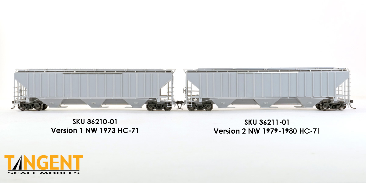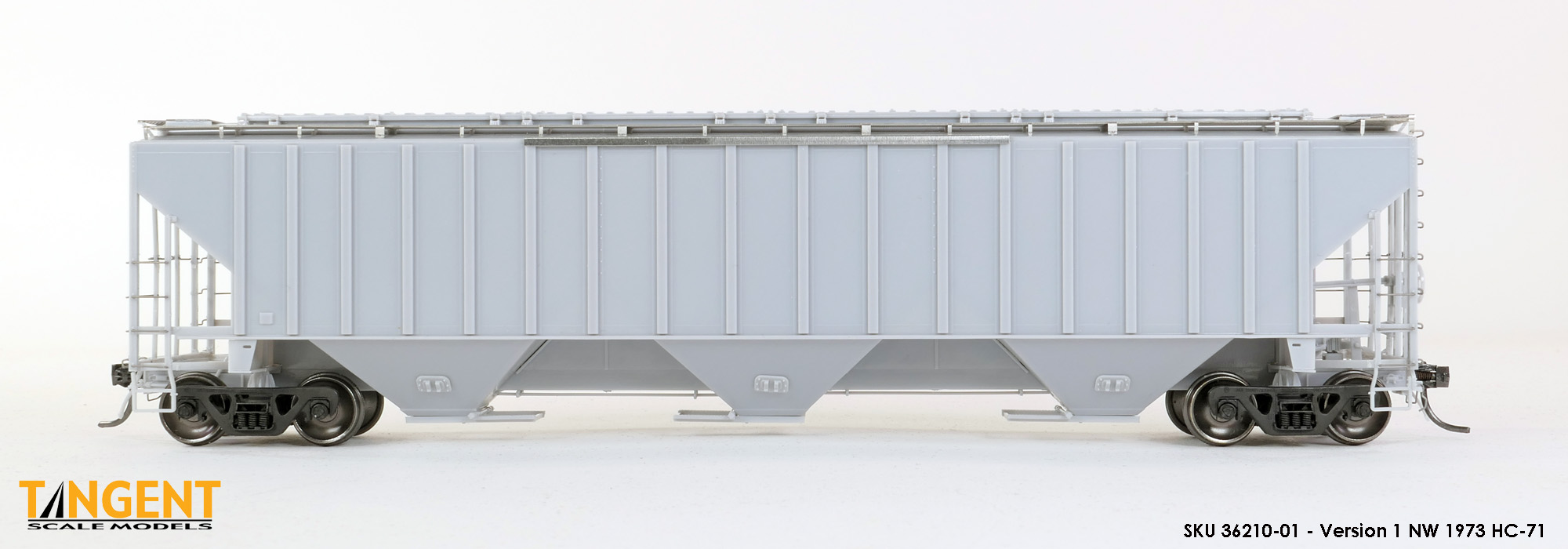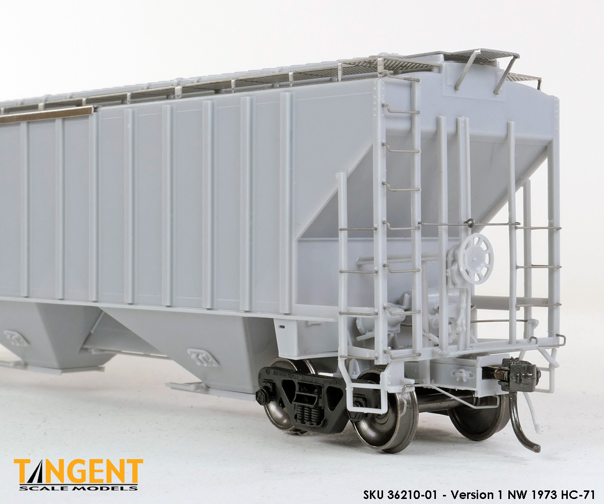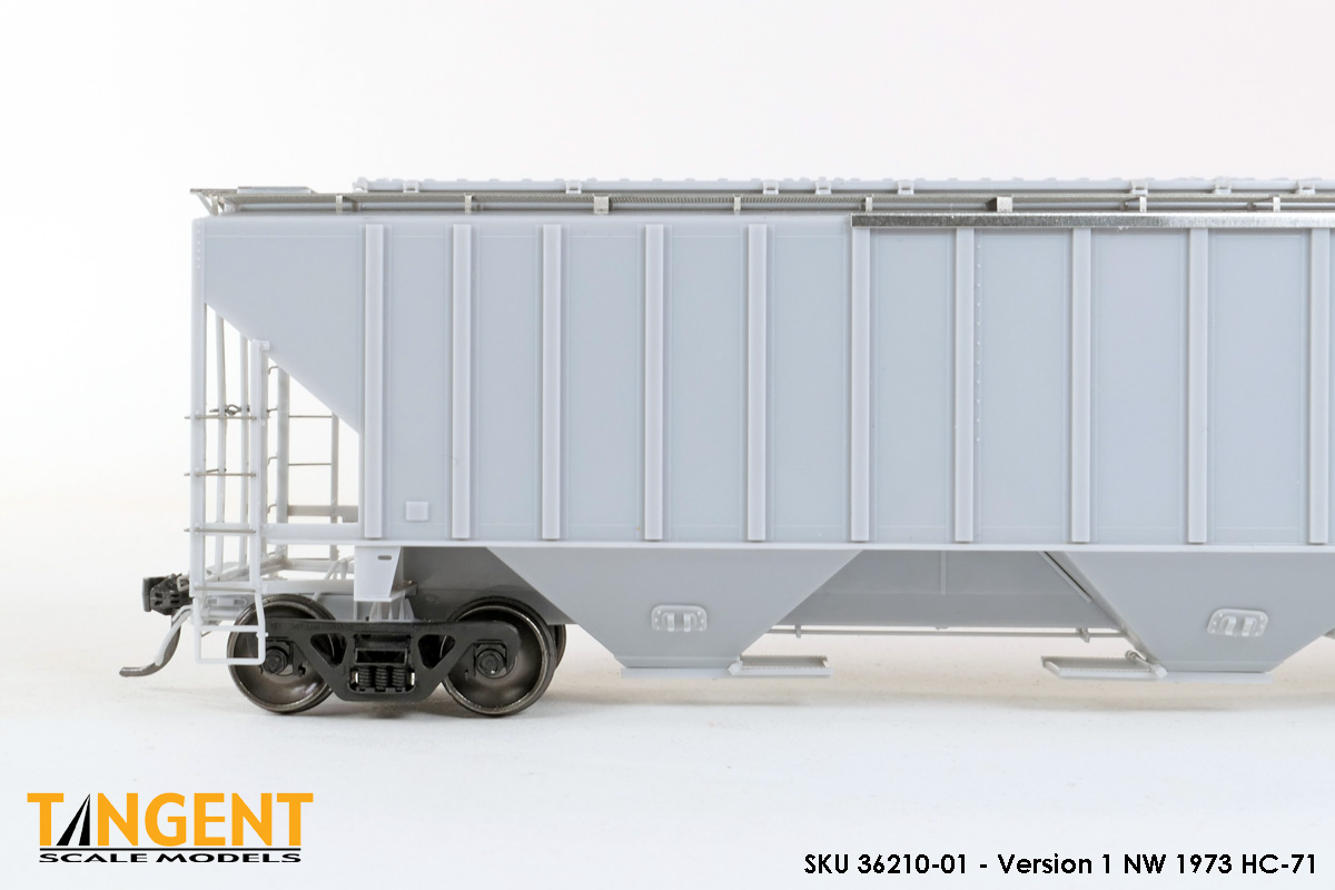 – Undecorated RTR Unpainted Version 1 NW 1973-1974 HC-71: This car is completely assembled and unpainted! It is based on the 1973/1974 HC-71 Roanoke group with ribbed roof hatches, slotted hole jacking pads above the bolsters, Ajax hand brake, Morton-style roof walkways and Keystone Portloc outlet gates. The model rides on Tangent’s unmatched 100-Ton Barber S-2 Roller Bearing Trucks with rotating Brenco-6 caps and 36” all-metal wheels. This model is ready for painting and lettering in an NW/NS prototype scheme or your own private road. Original NW series 177001-178000. SKU 36210-01