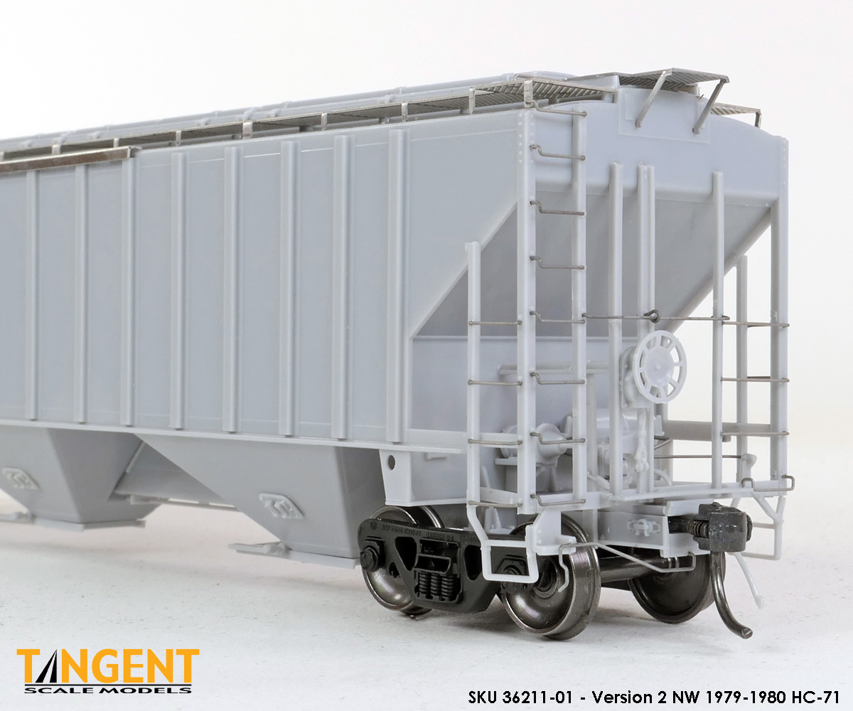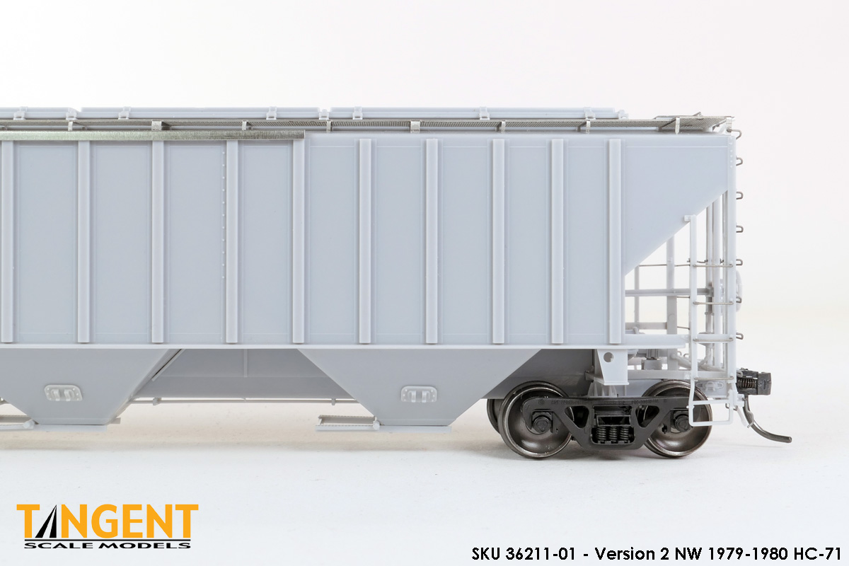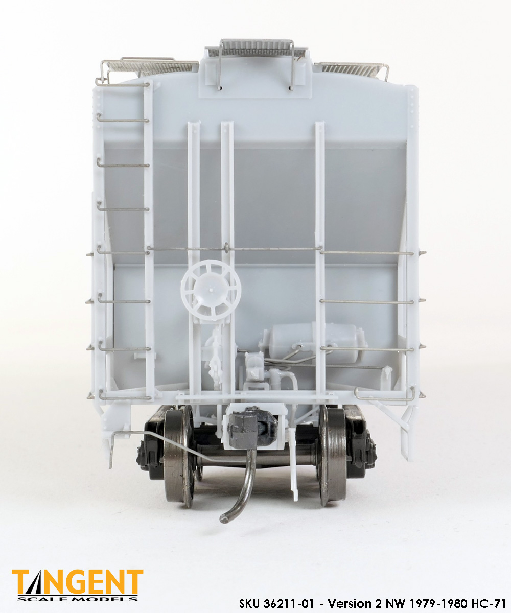 – Undecorated RTR Unpainted Version 2 NW 1979-1980 HC-71: This car is completely assembled and unpainted! It is based on the 1979-1980 HC-71 Roanoke group with smooth roof hatches, large hole jacking pads above the bolsters, Ajax hand brake, Morton-style roof walkways and Keystone Portloc outlet gates. The model rides on Tangent’s unmatched 100-Ton Barber S-2 Roller Bearing Trucks with rotating Brenco-3 caps and 36” all-metal wheels. This model is ready for painting and lettering in an NW/NS prototype scheme or your own private road. Original NW series 178001-178500. SKU 36211-01