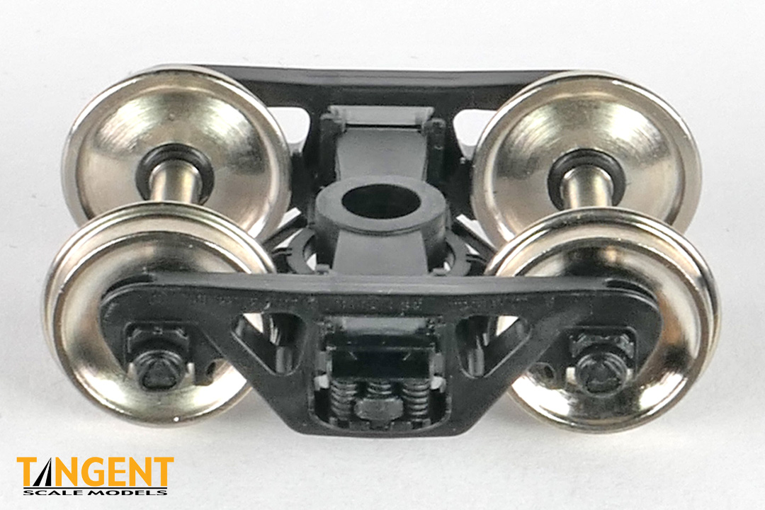 Each pair of trucks includes separately installed brake beams, rotating Timken bearing caps and the distinctive Stucki HS-7 Snubber detail in the center spring package area.