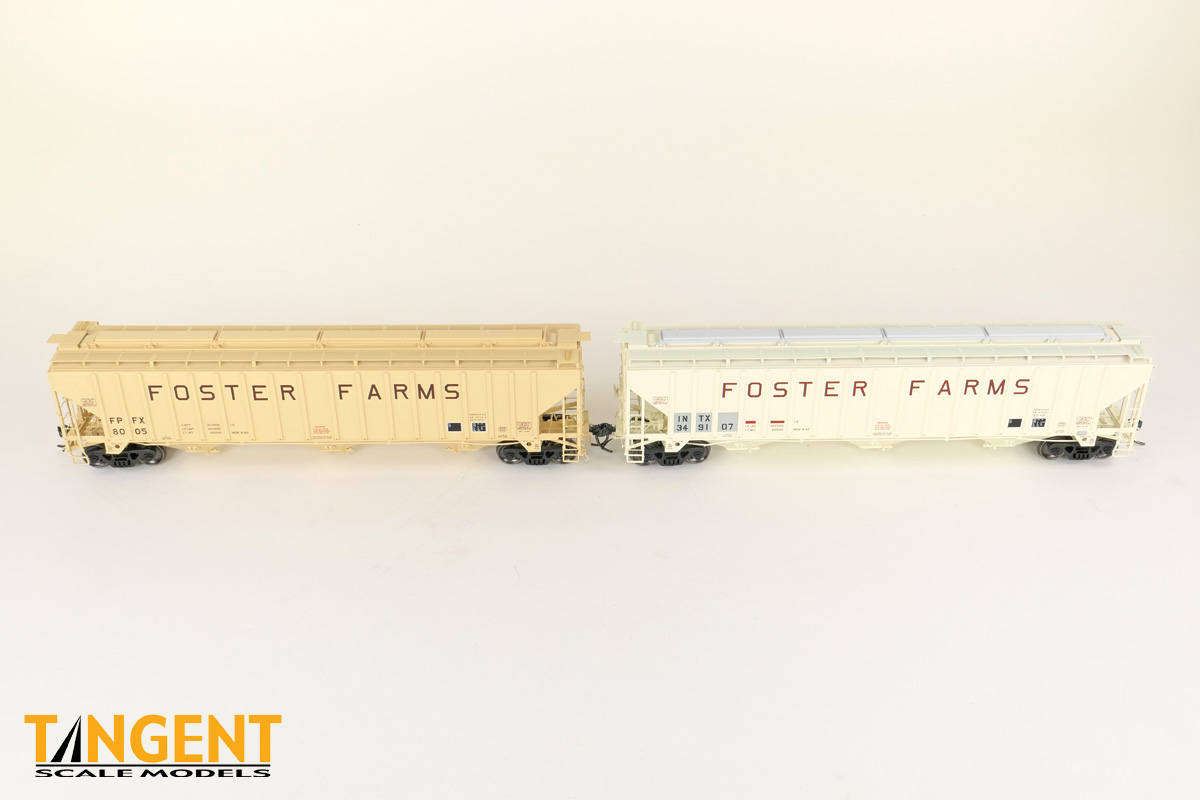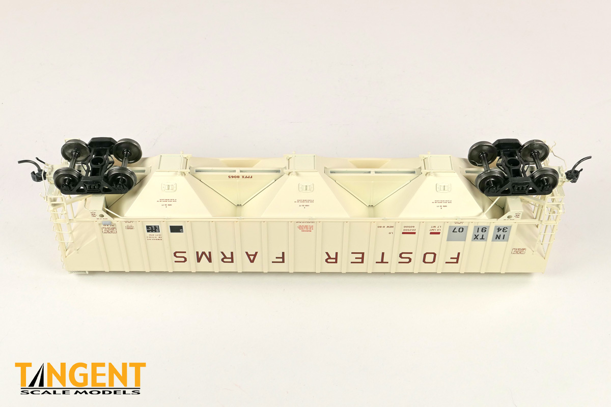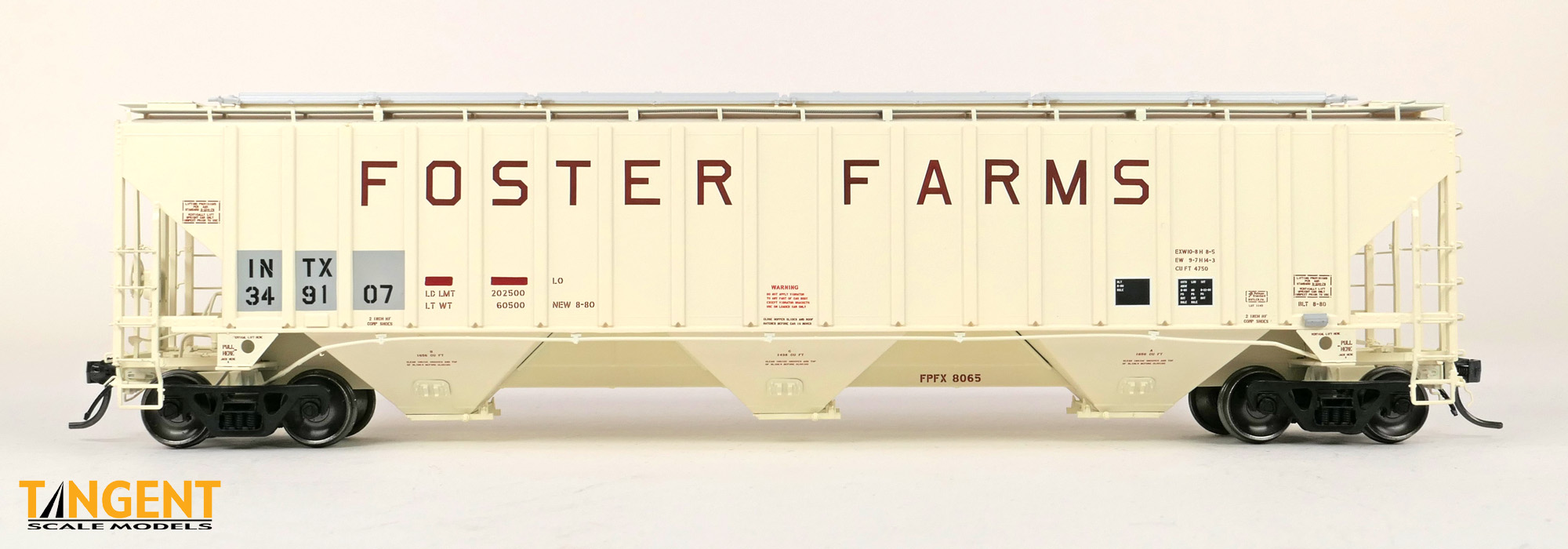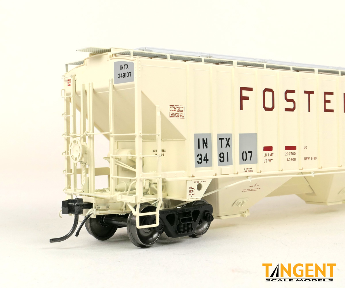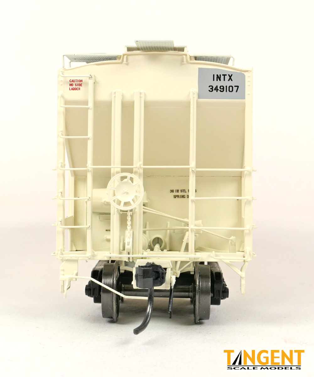 – INTX “ex-Foster Farms” 2011+ gives the mid-2000s guys a great patch offering. This example shows a former Foster Farms car that has been acquired by Interstate Commodities and is part of the massive INTX lease fleet. This ex-FPFX car features a faded version of the “Tea & Cream” body color and faded “Devils Food” lettering. The prototype car did not have delineators in 2011, so we didn’t put them on the model either! This car features an accurate 1980 Pullman 4750 body, including “open hole” side posts, thick sill protrusion over the bolsters and distinctive wider jacking tabs associated with much (but not all!) of Pullman’s late production. The center sill correctly models the body-mounted brake linkage “access holes” on one side of the car, just like the real one. If you look closely, we also added the AEI tag with an angled mounting bracket on the sill. Our 100-ton Barber S-2 trucks have the correct “Timken” rotating caps. This is an accurate patch. Do not miss out!