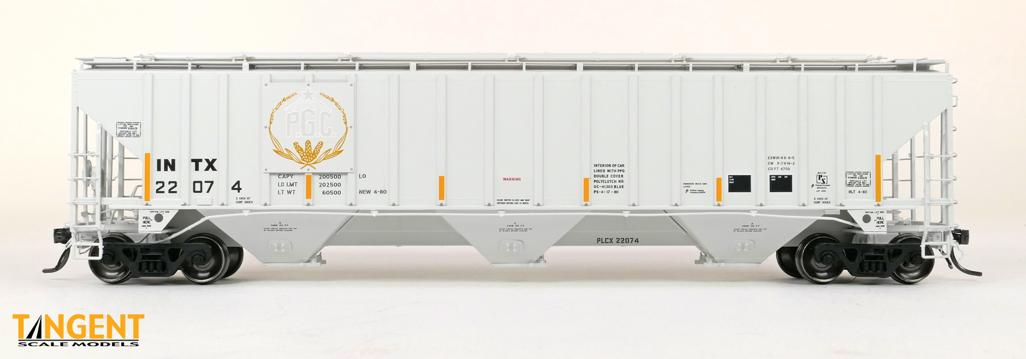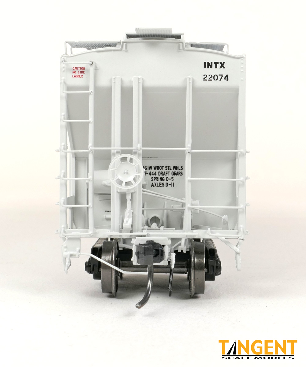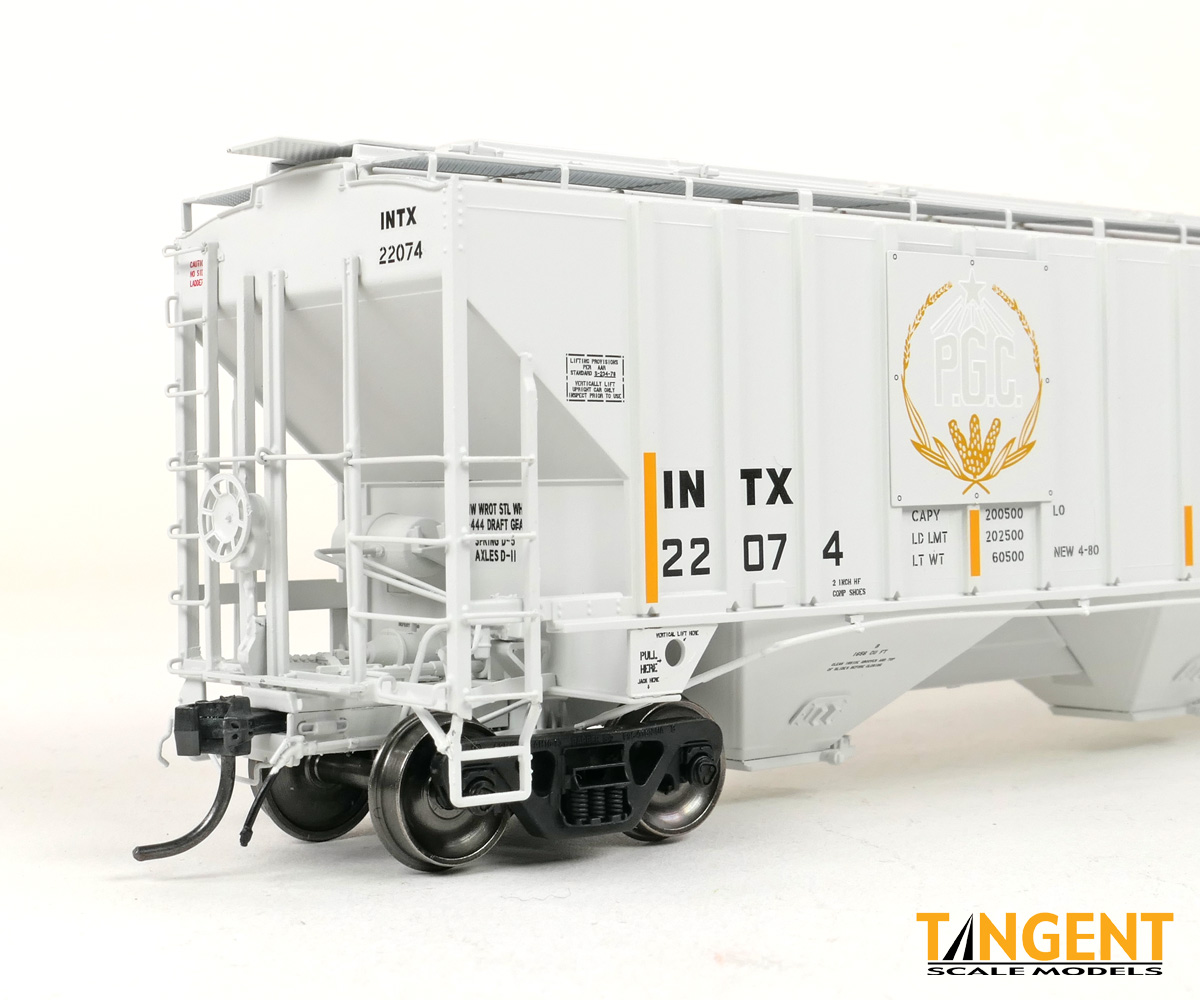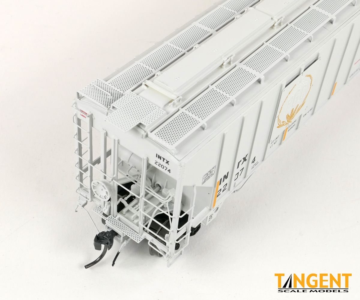 – INTX “ex-Producer’s Grain” 2015+ gives modelers a contemporary example of a patched car. We chose this ex-Producer’s Grain car that was acquired by Interstate Commodities and is part of the substantial INTX lease fleet. This car is sharp looking, with its faded gray paint, to match the prototype photo, conspicuity stripes and AEI tag bracket. The placard is still attached to the prototype car, so we included it on the model as well, in all its faded glory. These models have an accurate 1980 Pullman 4750 body, including “open hole” side posts, thick sill protrusion over the bolsters and distinctive wider jacking tabs. The models also feature Miner “Selflok” outlet gates.