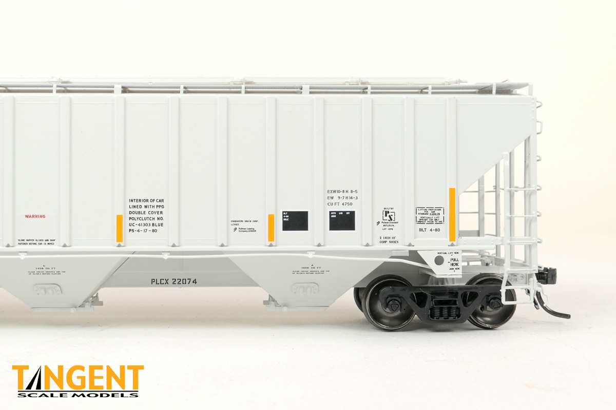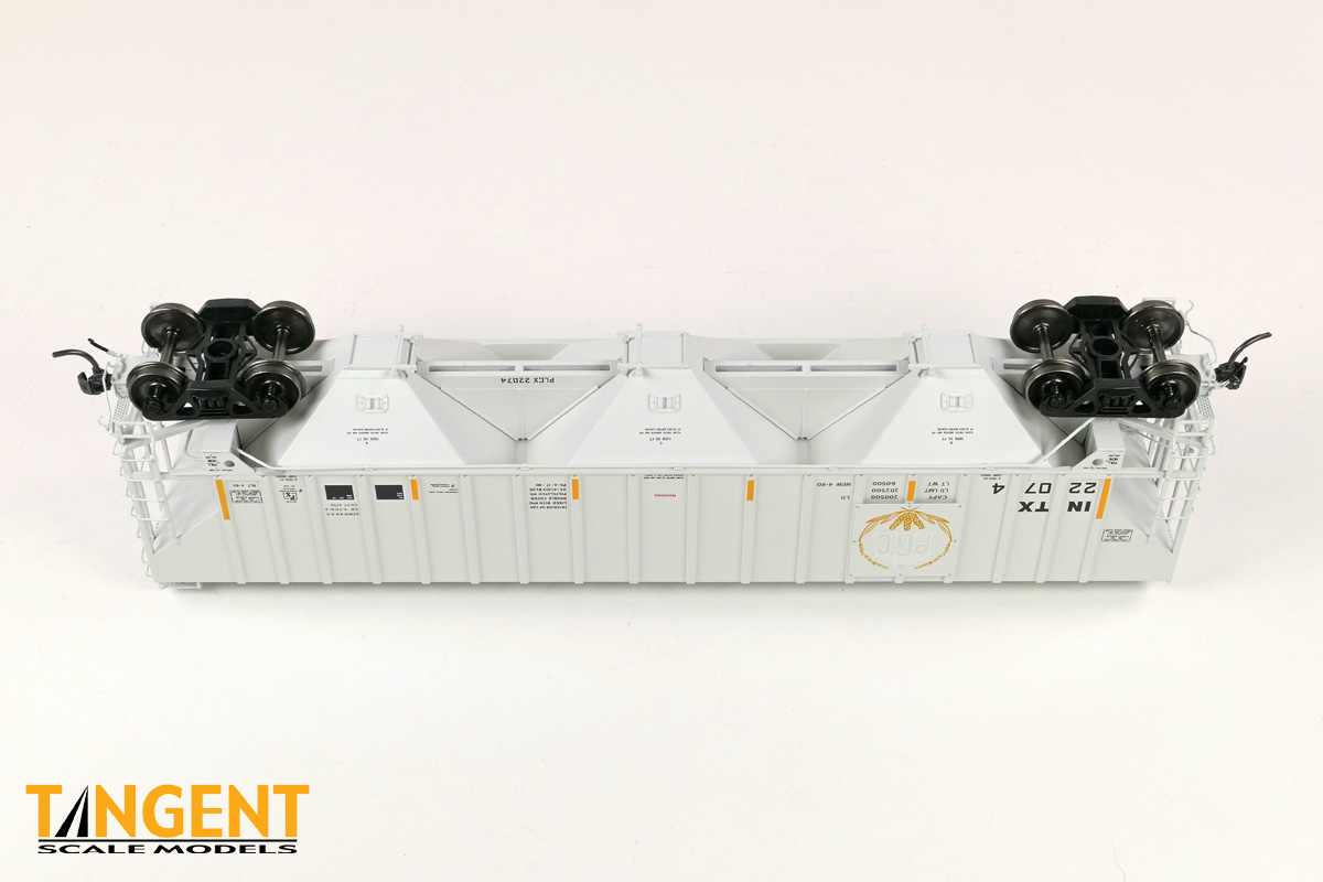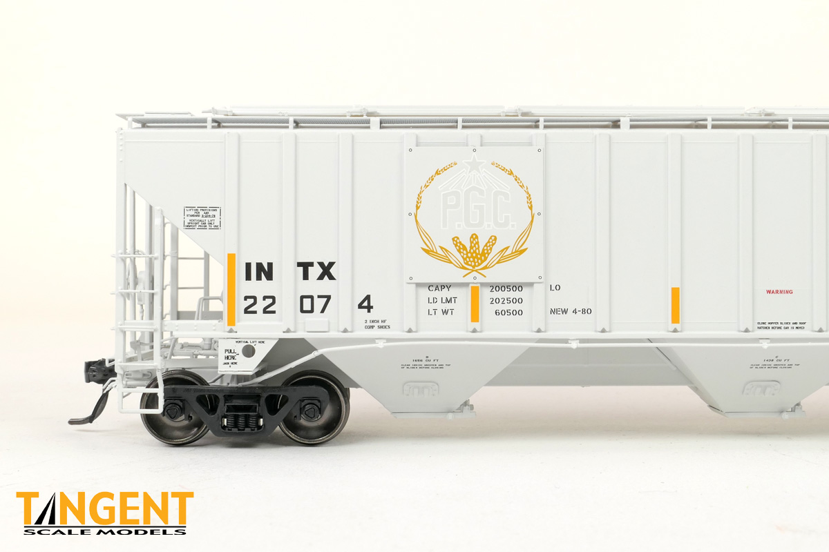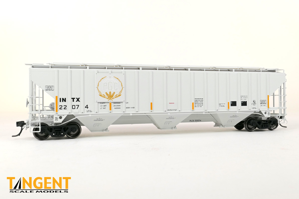 – INTX “ex-Producer’s Grain” 2015+ gives modelers a contemporary example of a patched car. We chose this ex-Producer’s Grain car that was acquired by Interstate Commodities and is part of the substantial INTX lease fleet. This car is sharp looking, with its faded gray paint, to match the prototype photo, conspicuity stripes and AEI tag bracket. The placard is still attached to the prototype car, so we included it on the model as well, in all its faded glory. These models have an accurate 1980 Pullman 4750 body, including “open hole” side posts, thick sill protrusion over the bolsters and distinctive wider jacking tabs. The models also feature Miner “Selflok” outlet gates.