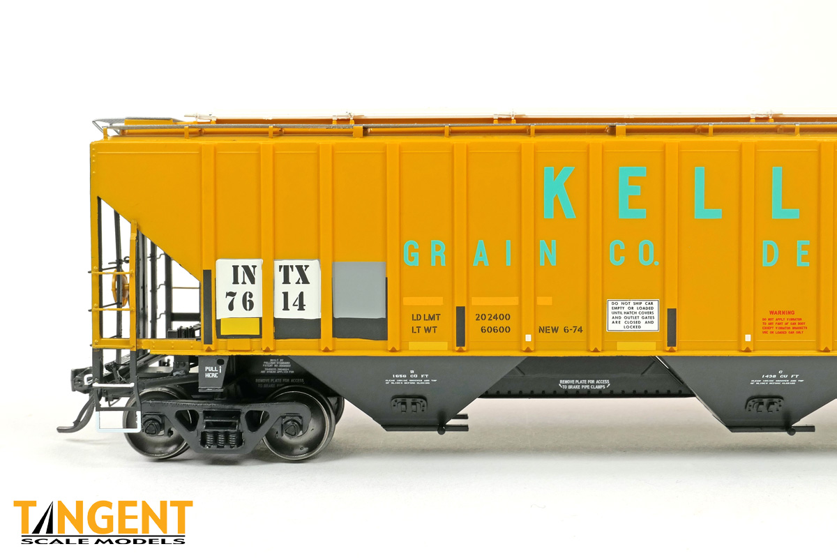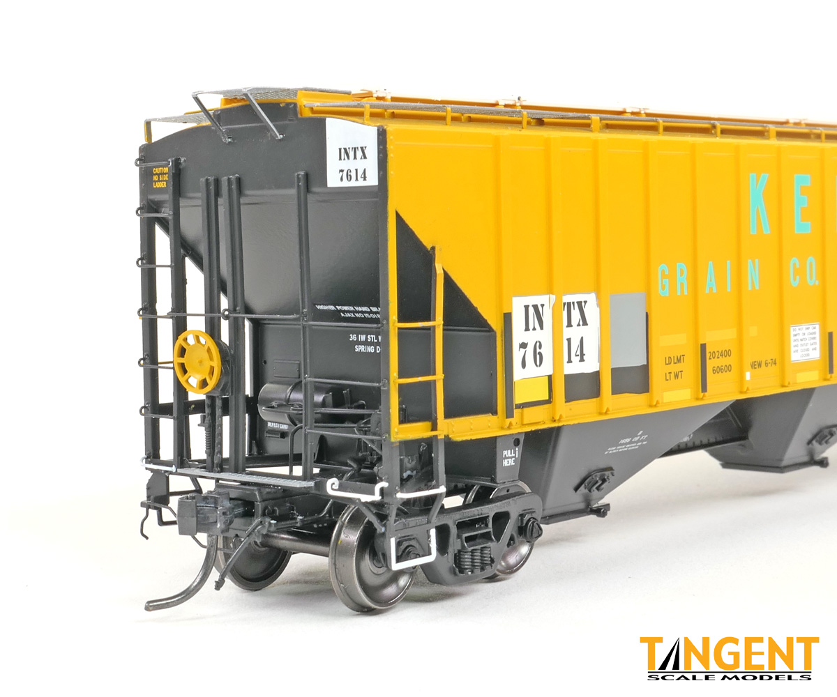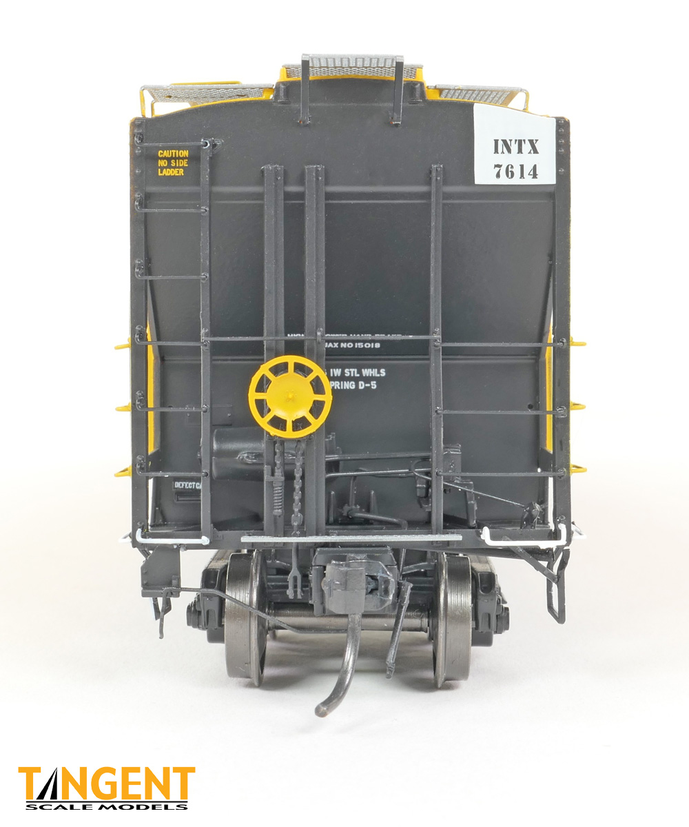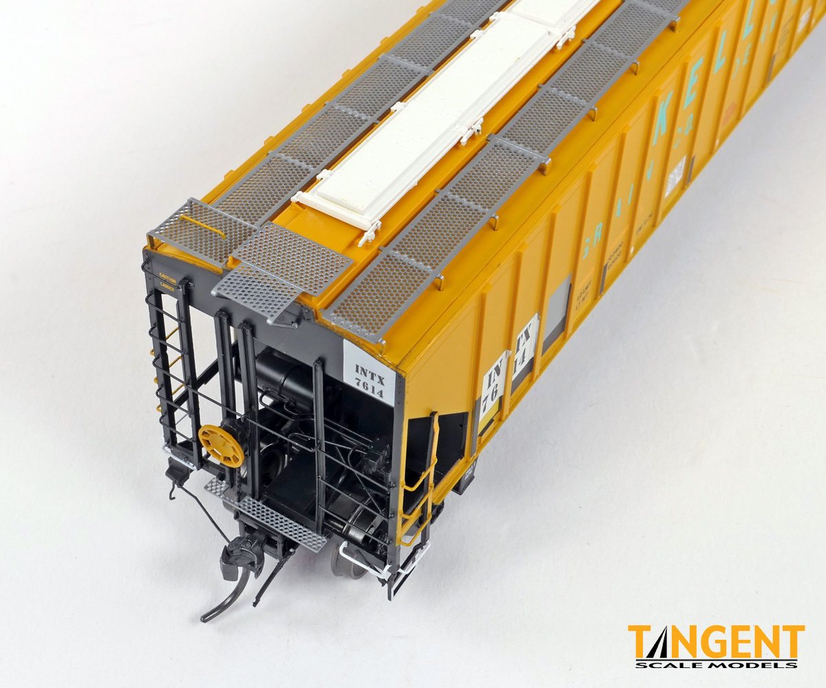 – INTX “ex-Kellogg Grain” 2015+ gives modelers a contemporary example of a patched car. We chose this ex-Kellogg Grain Co. car that was acquired by Interstate Commodities and is part of the substantial INTX lease fleet. This car is sharp looking, with a carbody that has weathered to a darker yellow, Kellogg graphics have weathered from blue to green and a roof walkway that has lost its original yellow paint. The car replicates the complicated dance of 2015 lettering. This translates to original Kellogg lettering, former lessor lettering, paint-outs of conspicuity stripes, reapplication of conspicuity stripes and more. And yes, don’t worry, we have the AEI tag and bracket mounted on the car where it should be. This ex-PTLX car features a Pullman body with open-hole posts, center-tube train air line, and truck mounted brake hardware. (Notice there is no brake cylinder on the B-End!) The bays are equipped with beautifully replicated early-style Miner outlet gates. Up on top, the roof features replacement roof hatch covers. The model is equipped our 100-ton Barber S-2 trucks with accurate “Timken” rotating caps and correct truck-mounted brake beams. INTX lease fleet cars have never been so easy!