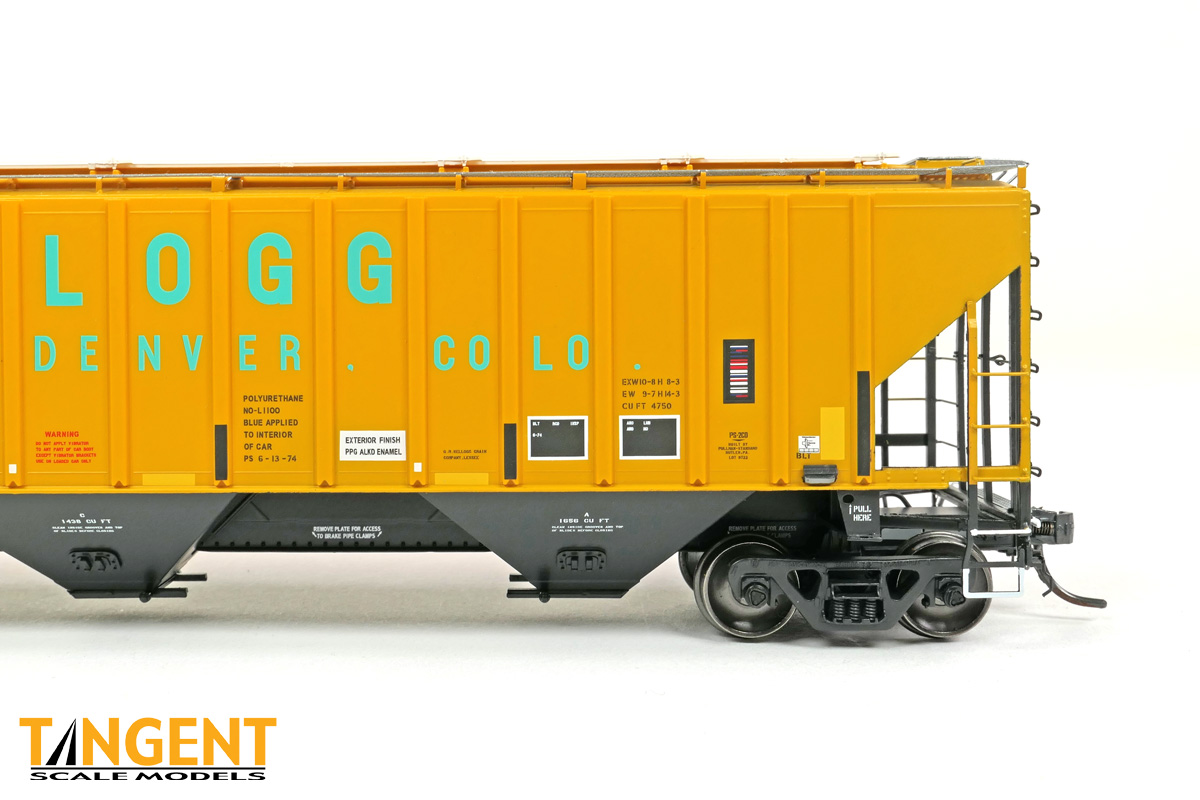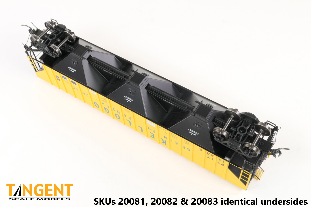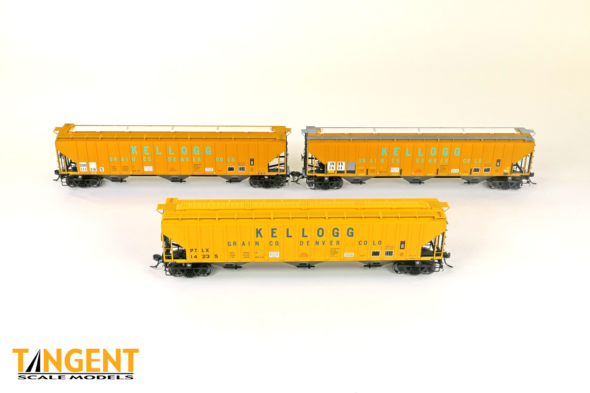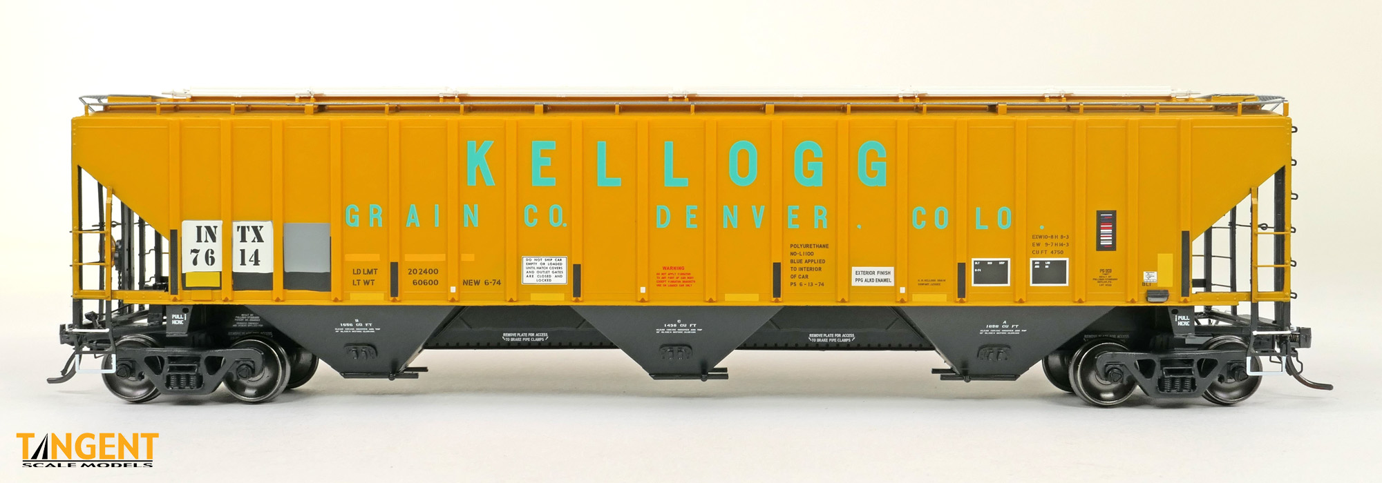 – INTX “ex-Kellogg Grain” 2015+ gives modelers a contemporary example of a patched car. We chose this ex-Kellogg Grain Co. car that was acquired by Interstate Commodities and is part of the substantial INTX lease fleet. This car is sharp looking, with a carbody that has weathered to a darker yellow, Kellogg graphics have weathered from blue to green and a roof walkway that has lost its original yellow paint. The car replicates the complicated dance of 2015 lettering. This translates to original Kellogg lettering, former lessor lettering, paint-outs of conspicuity stripes, reapplication of conspicuity stripes and more. And yes, don’t worry, we have the AEI tag and bracket mounted on the car where it should be. This ex-PTLX car features a Pullman body with open-hole posts, center-tube train air line, and truck mounted brake hardware. (Notice there is no brake cylinder on the B-End!) The bays are equipped with beautifully replicated early-style Miner outlet gates. Up on top, the roof features replacement roof hatch covers. The model is equipped our 100-ton Barber S-2 trucks with accurate “Timken” rotating caps and correct truck-mounted brake beams. INTX lease fleet cars have never been so easy!