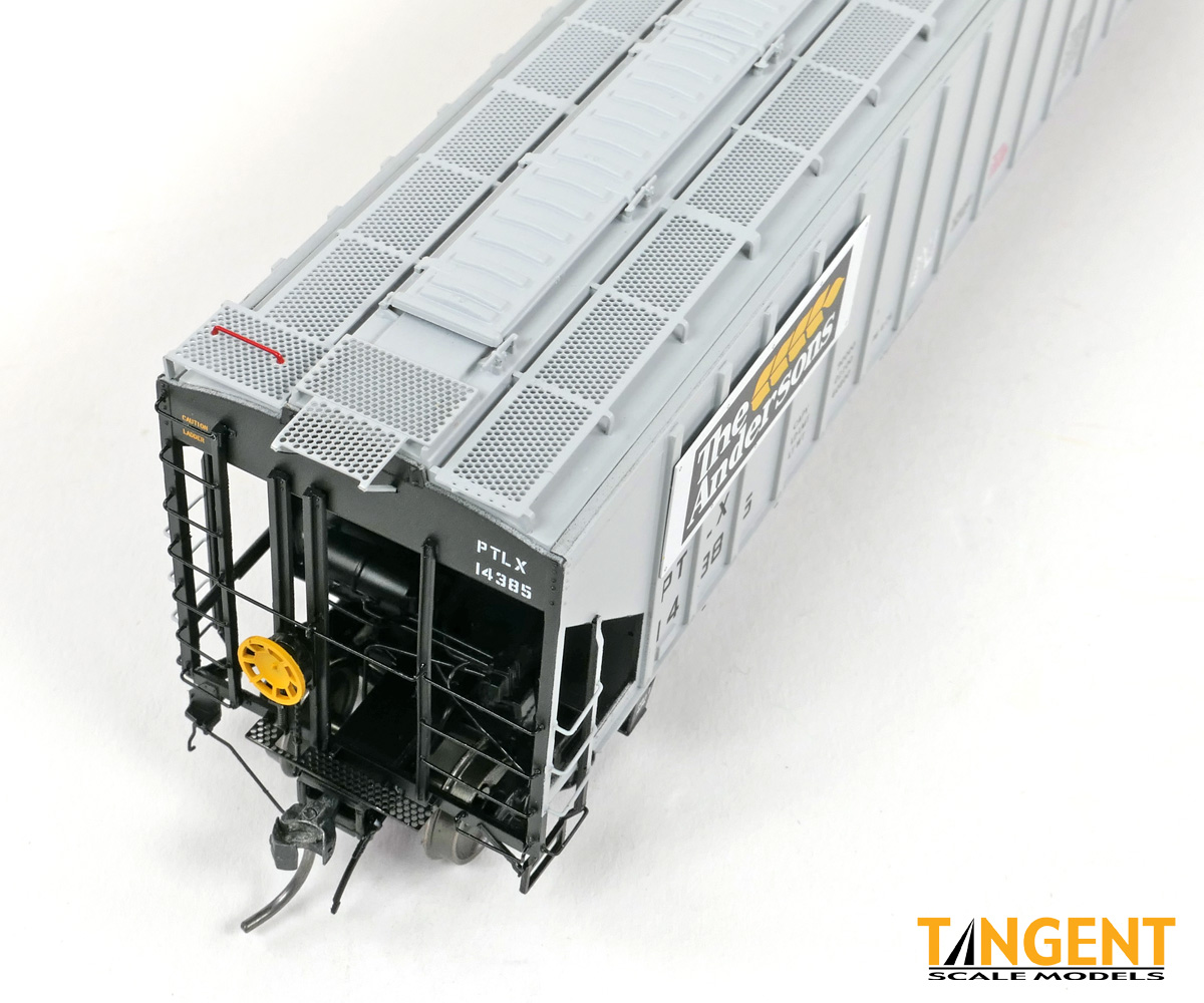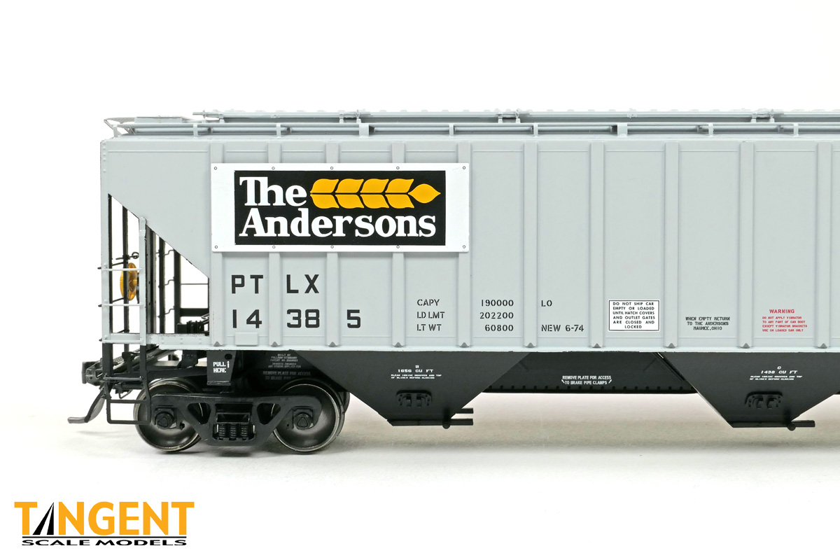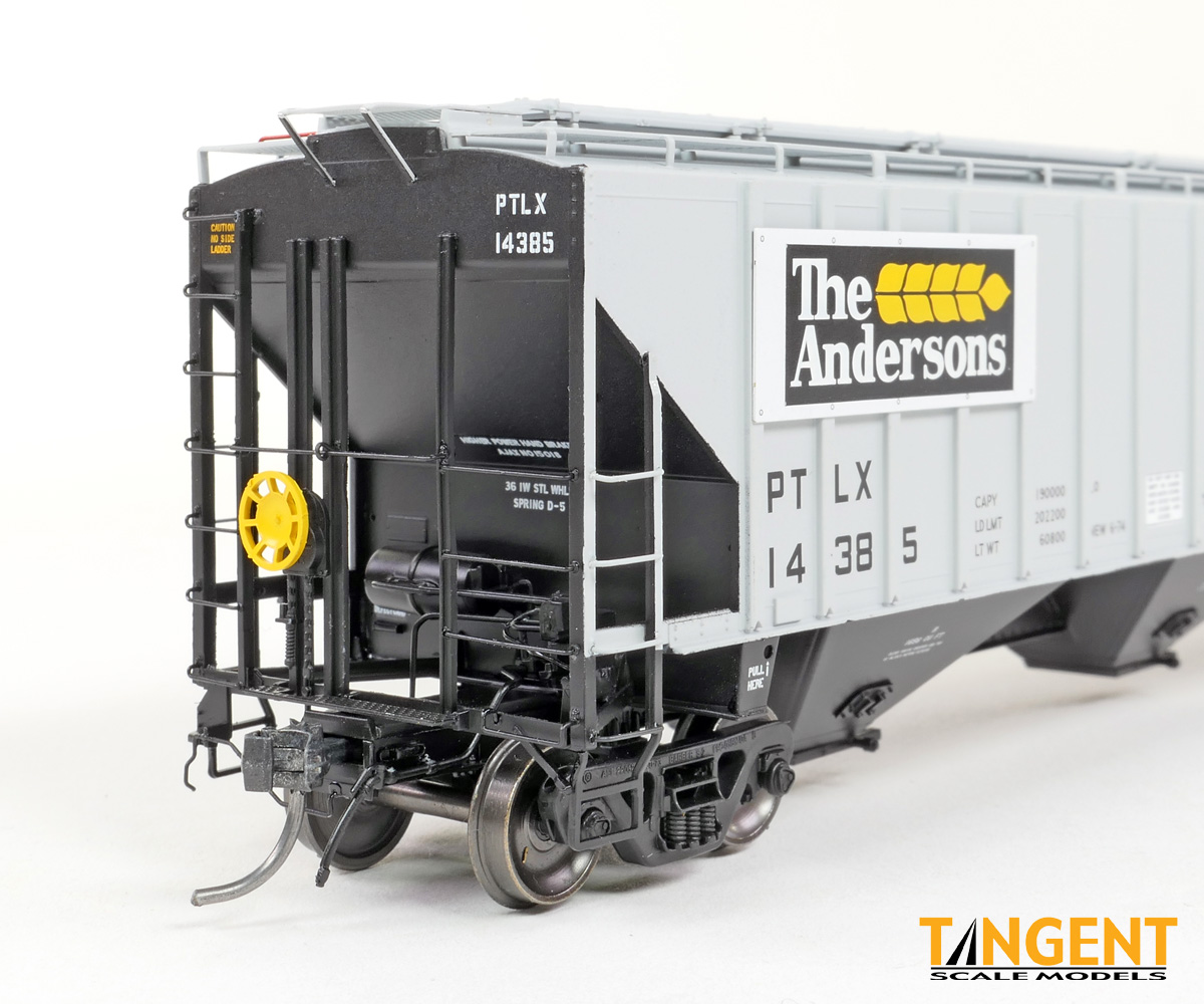 – PTLX “The Andersons 1974” duplicates a beautiful gray Pullman leaser, with stand-off “The Andersons” placard and the classic PTLX gray-with-black-ends paint scheme. This PTLX group of cars features a Pullman body with open-hole posts, center-tube train air line, and truck mounted brake hardware. (Notice there is no brake cylinder on the B-End!) The bays are equipped with beautifully replicated early-style Miner outlet gates. Up on the roof, you can see that detailed see-though Morton walkway and matching Morton crossover platforms on the ends. Each and every piece of data on this car is carefully replicated, from one-inch COTS box to the separate “The Andersons” placard art. The models come equipped our 100-ton Barber S-2 trucks with accurate “Timken” rotating caps and correct truck-mounted brake beams. From the red roof grab irons down to the PTLX reporting marks printed on the draft gear, this paint scheme is winner.