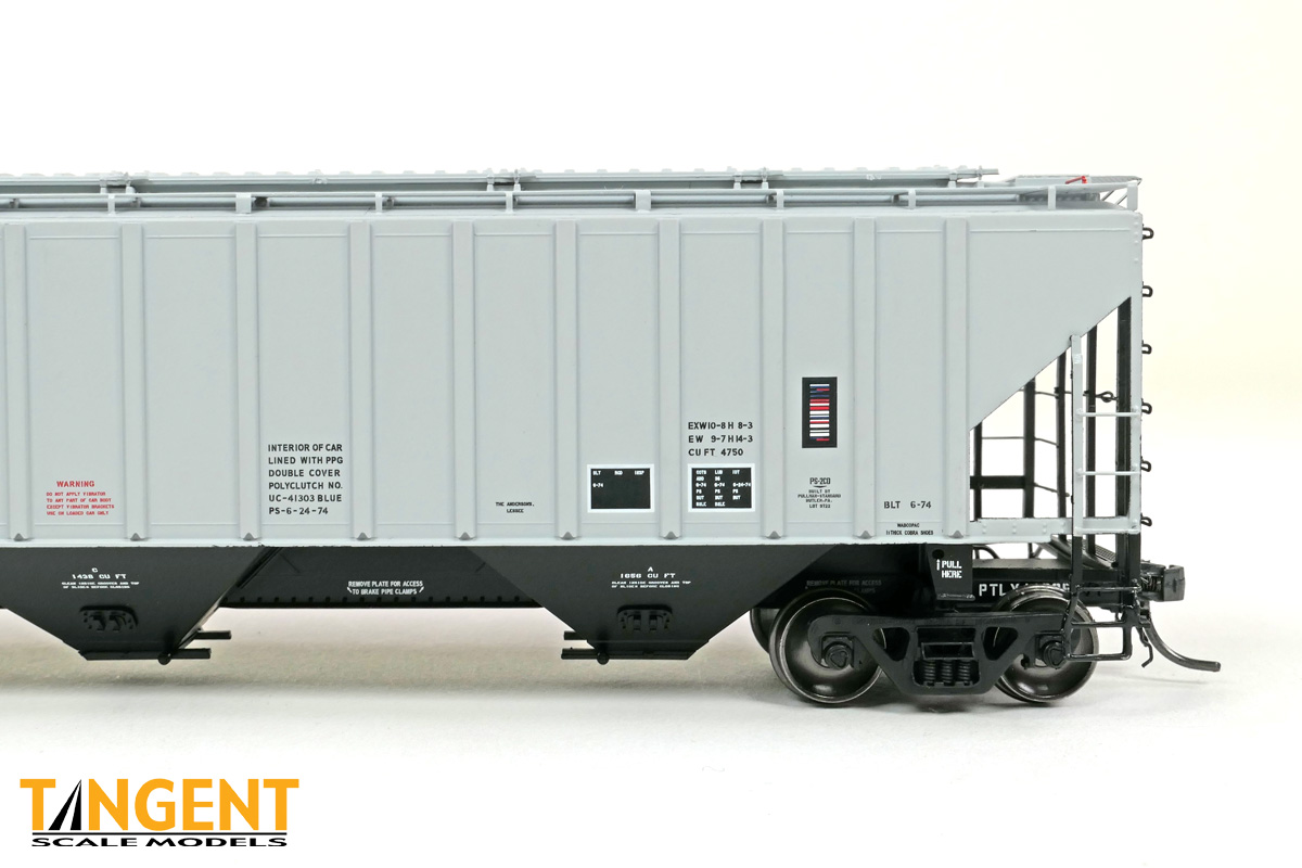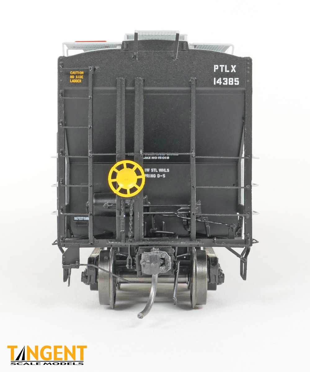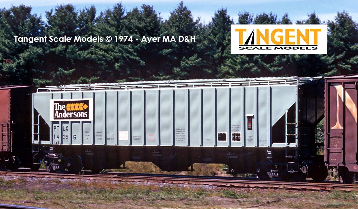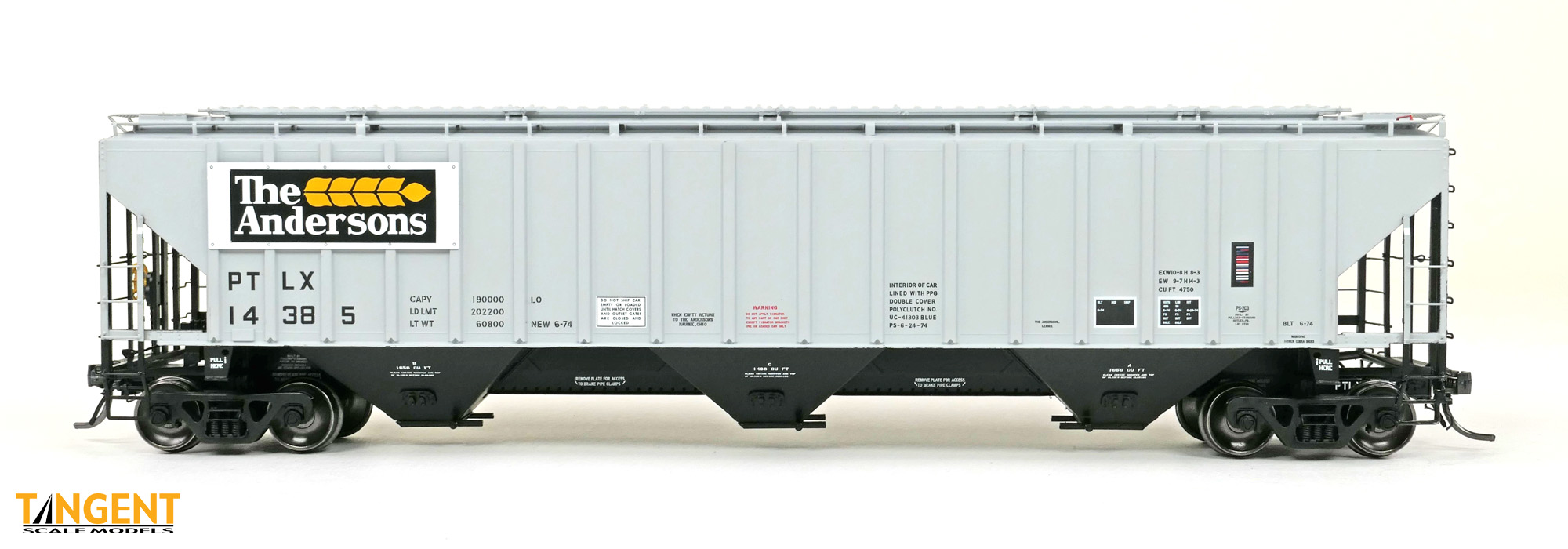 – PTLX “The Andersons 1974” duplicates a beautiful gray Pullman leaser, with stand-off “The Andersons” placard and the classic PTLX gray-with-black-ends paint scheme. This PTLX group of cars features a Pullman body with open-hole posts, center-tube train air line, and truck mounted brake hardware. (Notice there is no brake cylinder on the B-End!) The bays are equipped with beautifully replicated early-style Miner outlet gates. Up on the roof, you can see that detailed see-though Morton walkway and matching Morton crossover platforms on the ends. Each and every piece of data on this car is carefully replicated, from one-inch COTS box to the separate “The Andersons” placard art. The models come equipped our 100-ton Barber S-2 trucks with accurate “Timken” rotating caps and correct truck-mounted brake beams. From the red roof grab irons down to the PTLX reporting marks printed on the draft gear, this paint scheme is winner.
