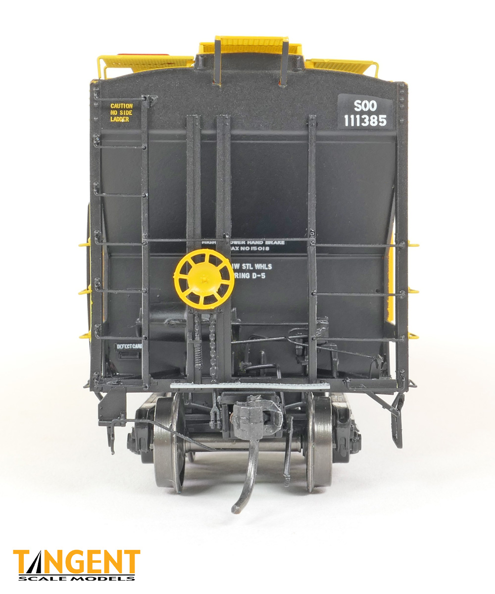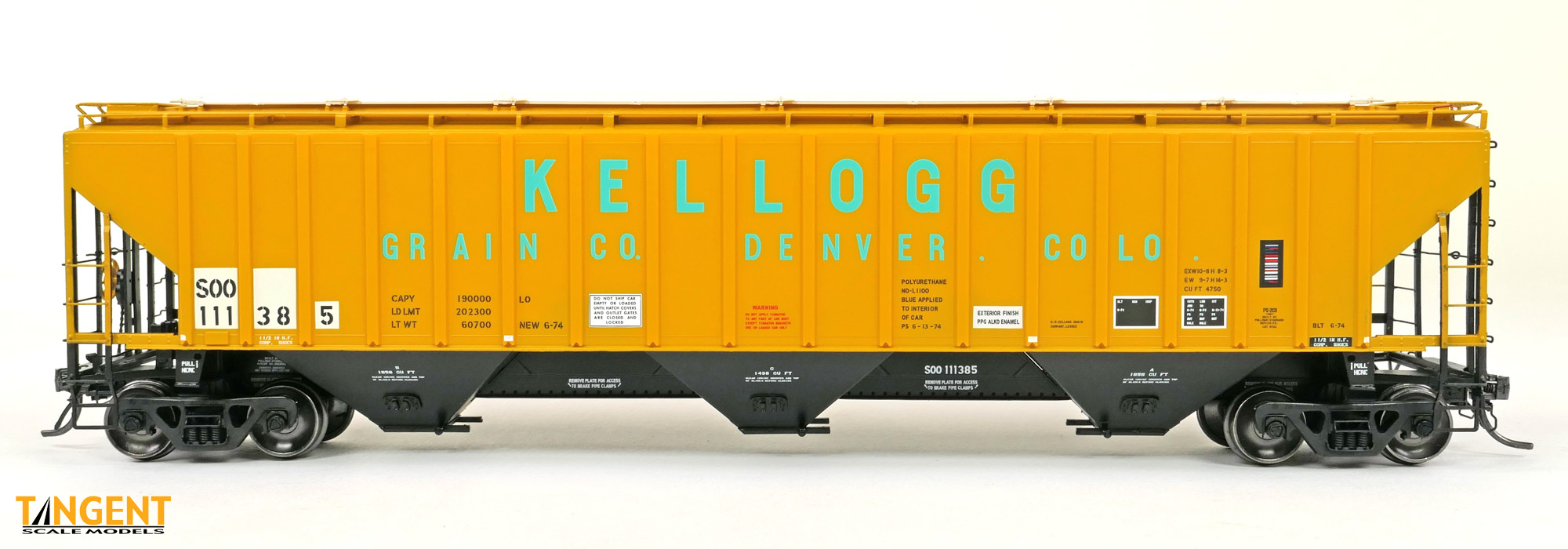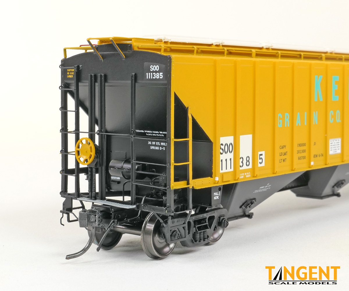 – SOO “ex-Kellogg Grain” 1989+ replicates an example of a 1980s secondhand car, as SOO Line expanded their grain fleet. SOO applied reporting mark patches and small reflective white delineators on some carbody posts. The prototype carbody has weathered to a darker yellow, and the Kellogg graphics have weathered from blue to green. These prototype paint features are carefully replicated on this SOO model. This ex-PTLX car features a Pullman body with open-hole posts, center-tube train air line, and truck mounted brake hardware. (Notice there is no brake cylinder on the B-End!) The bays are equipped with beautifully replicated early-style Miner outlet gates. Up on top, the roof features replacement roof hatch covers. The model is equipped our 100-ton Barber S-2 trucks with accurate “Timken” rotating caps and correct truck-mounted brake beams. This is a sharp looking SOO patch.