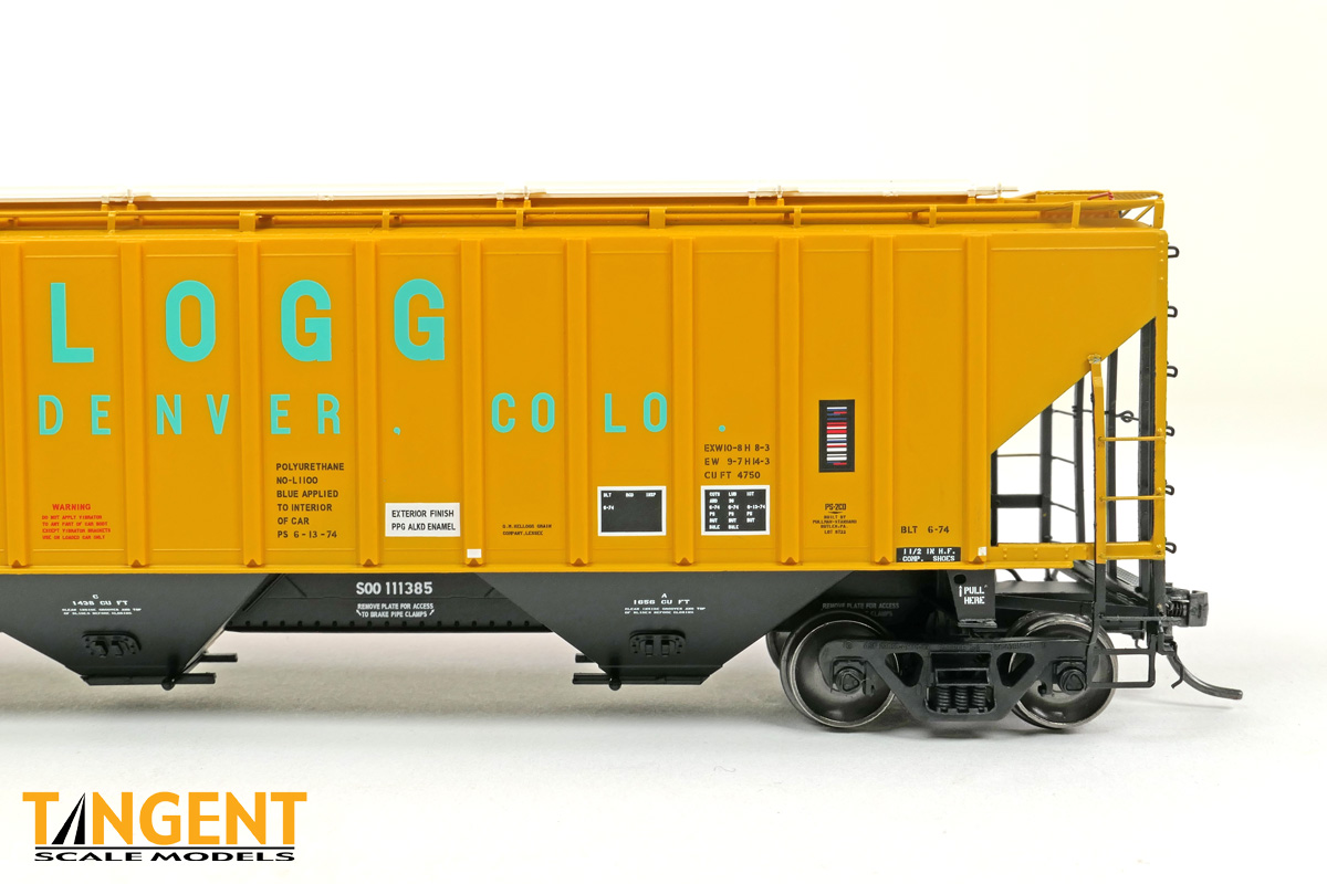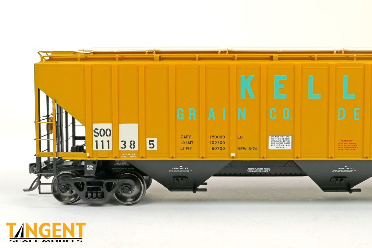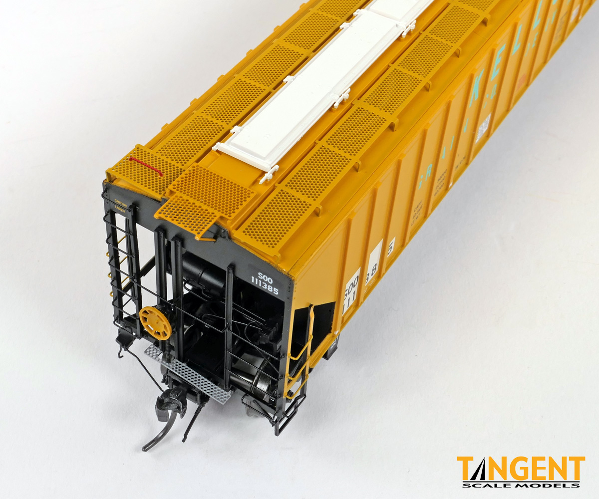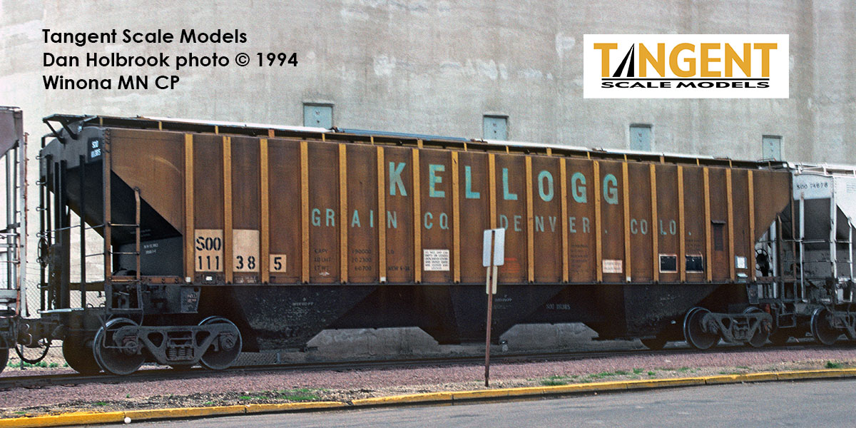 – SOO “ex-Kellogg Grain” 1989+ replicates an example of a 1980s secondhand car, as SOO Line expanded their grain fleet. SOO applied reporting mark patches and small reflective white delineators on some carbody posts. The prototype carbody has weathered to a darker yellow, and the Kellogg graphics have weathered from blue to green. These prototype paint features are carefully replicated on this SOO model. This ex-PTLX car features a Pullman body with open-hole posts, center-tube train air line, and truck mounted brake hardware. (Notice there is no brake cylinder on the B-End!) The bays are equipped with beautifully replicated early-style Miner outlet gates. Up on top, the roof features replacement roof hatch covers. The model is equipped our 100-ton Barber S-2 trucks with accurate “Timken” rotating caps and correct truck-mounted brake beams. This is a sharp looking SOO patch.