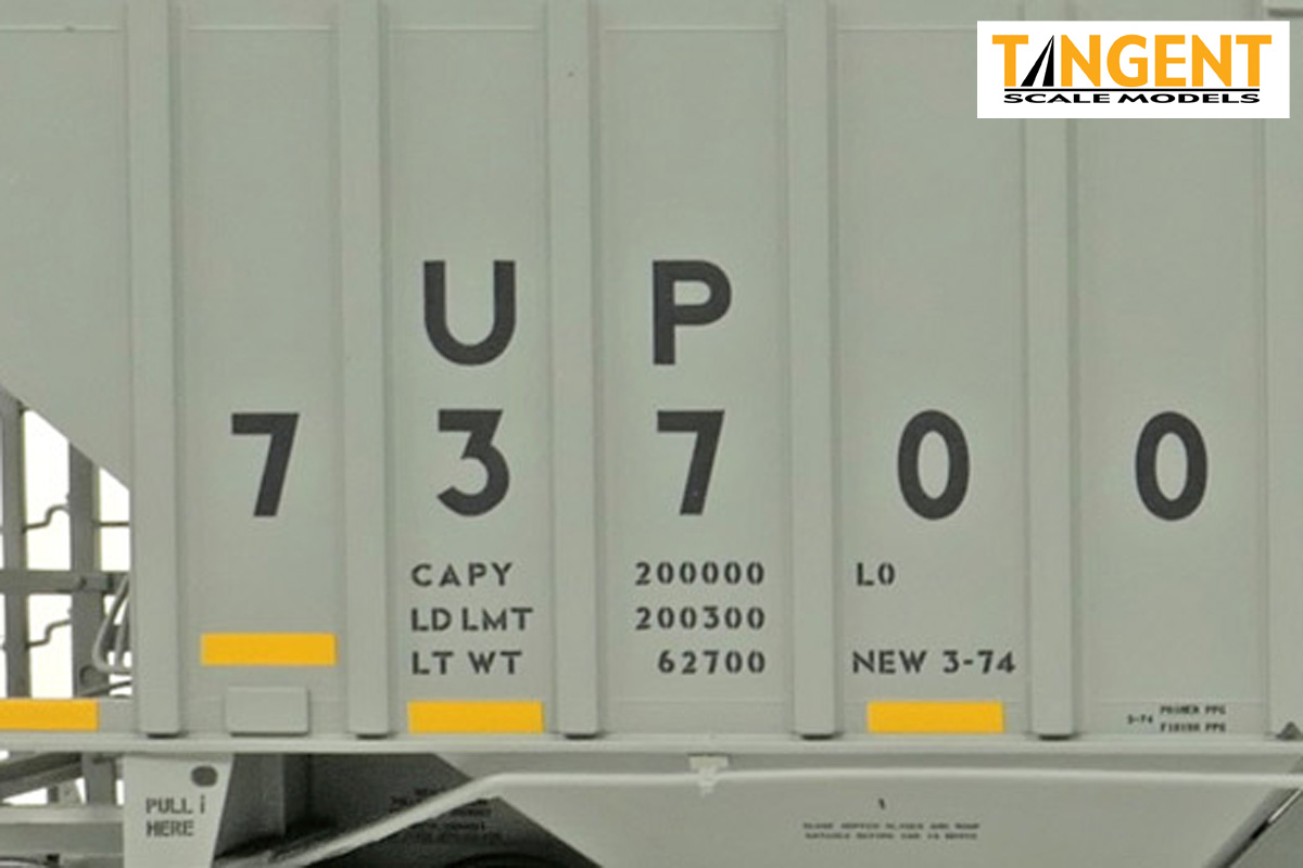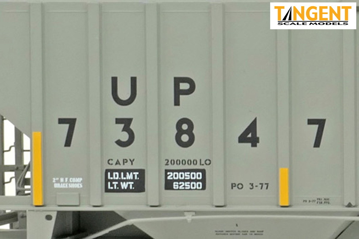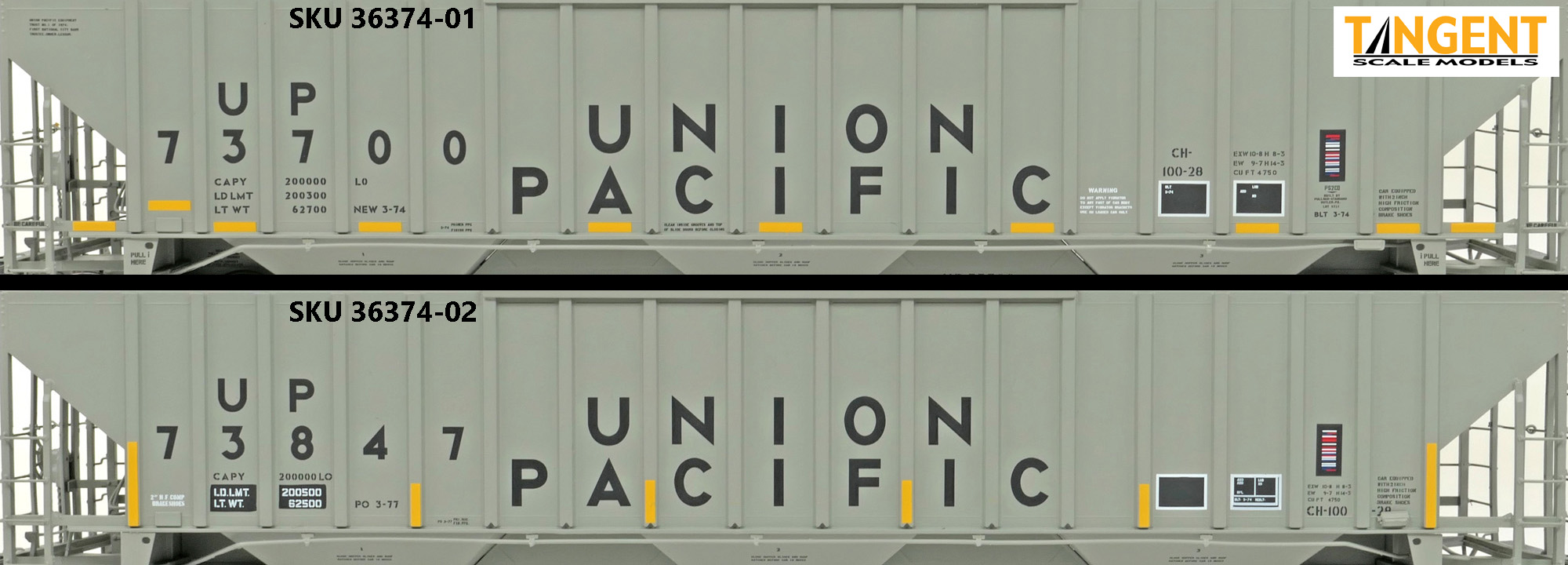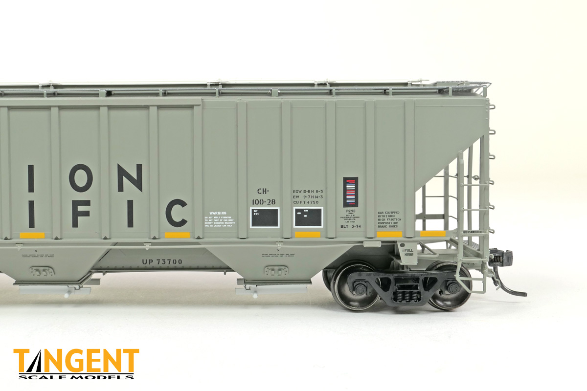 – UP “Delivery CH-100-28” With Conspicuity 2005+ offers “modern” modelers of the last 20 years two distinctive UP variations. We chose two specific numbers from the 1974 UP Pullman group and offer them in “Conspicuity Era” configuration. For SKU 36374-01, that translates to UP 73700, still wearing its Pullman delivery paint. The roof hatches have been swapped out to a smooth replacement style. The outlet gates have been replaced with modern bolt-on offerings. For SKU 36374-02, that translates to UP 73847, a UP Pocatello Idaho Shops repaint from 1977, with varying data, replacement roof hatches, and replacement modern outlet gates. Both Tangent models feature a correct Pullman combination closed-hole/open-hole body, weathered UP gray body color with conspicuity stripes added, faded warning stencils and yes, (different!) AEI tag parts mounted, per photos. The models come equipped with body-mounted brake hardware and our 100-ton Barber S-2 trucks with accurate “Hyatt” rotating caps.