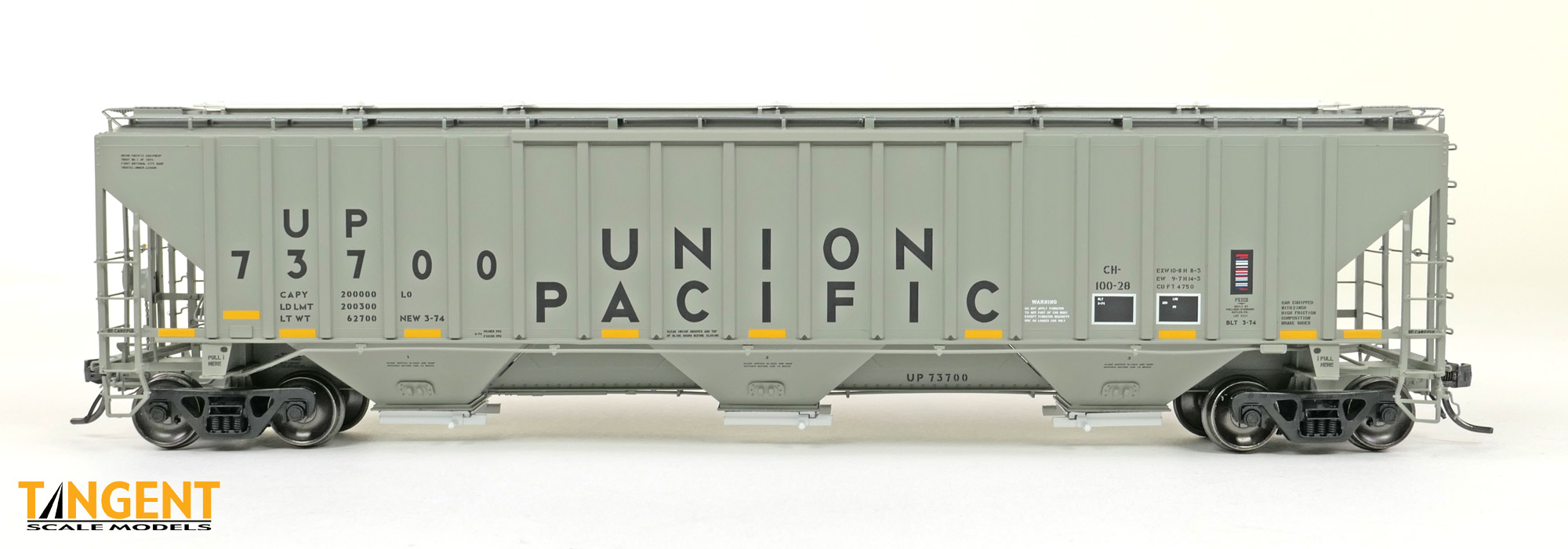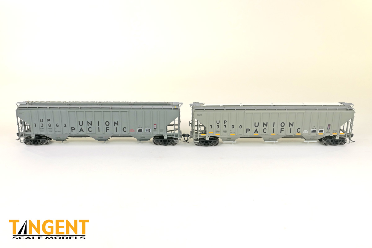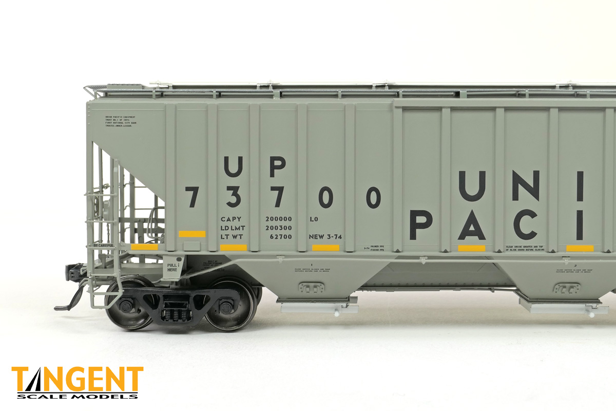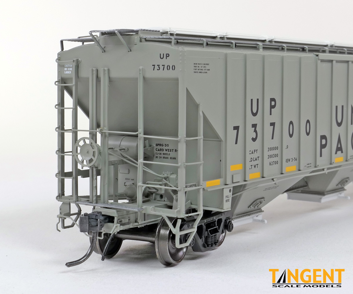 – UP “Delivery CH-100-28” With Conspicuity 2005+ offers “modern” modelers of the last 20 years two distinctive UP variations. We chose two specific numbers from the 1974 UP Pullman group and offer them in “Conspicuity Era” configuration. For SKU 36374-01, that translates to UP 73700, still wearing its Pullman delivery paint. The roof hatches have been swapped out to a smooth replacement style. The outlet gates have been replaced with modern bolt-on offerings. For SKU 36374-02, that translates to UP 73847, a UP Pocatello Idaho Shops repaint from 1977, with varying data, replacement roof hatches, and replacement modern outlet gates. Both Tangent models feature a correct Pullman combination closed-hole/open-hole body, weathered UP gray body color with conspicuity stripes added, faded warning stencils and yes, (different!) AEI tag parts mounted, per photos. The models come equipped with body-mounted brake hardware and our 100-ton Barber S-2 trucks with accurate “Hyatt” rotating caps.