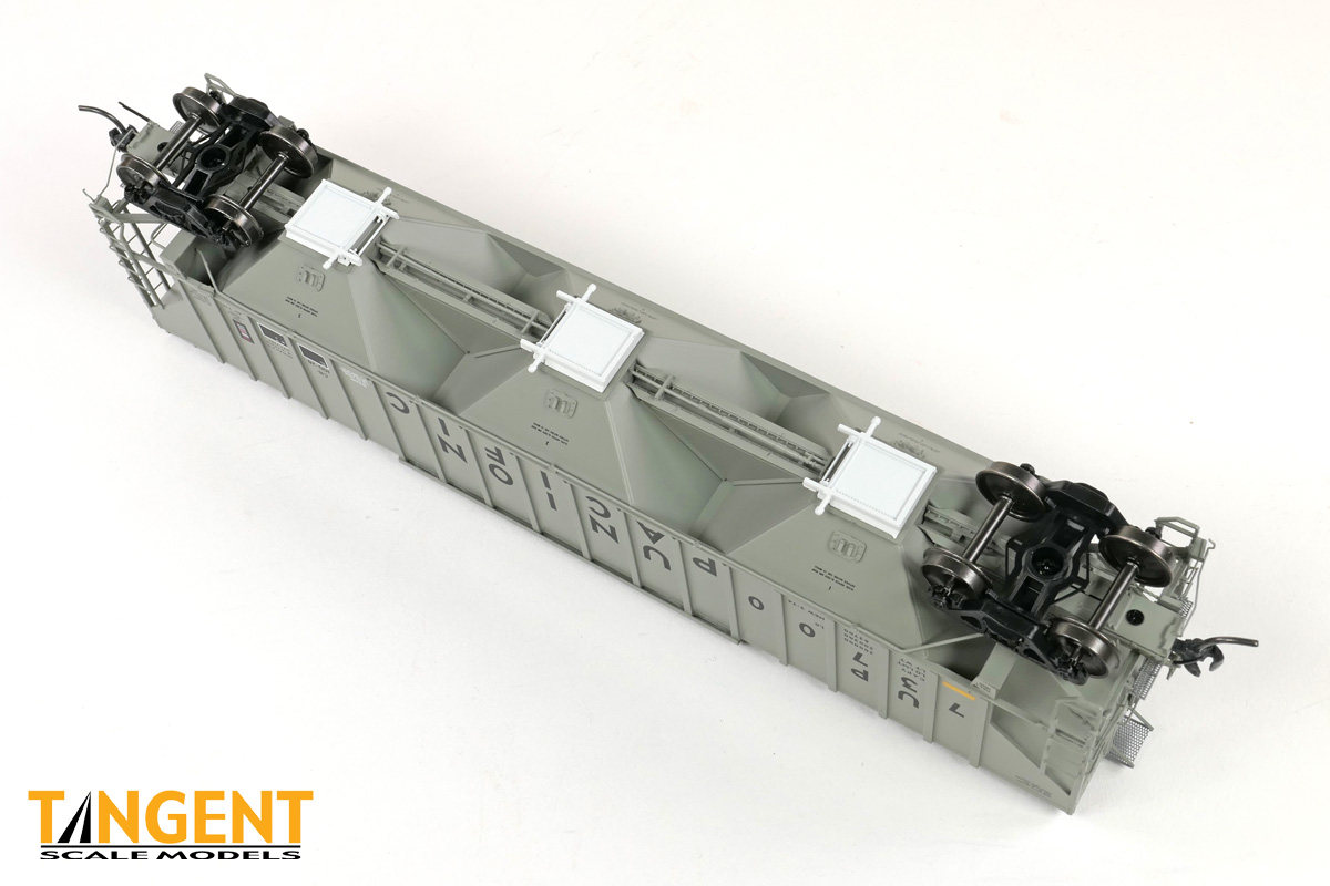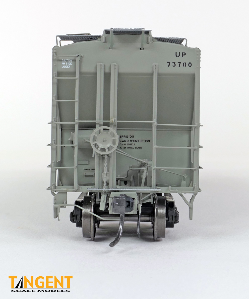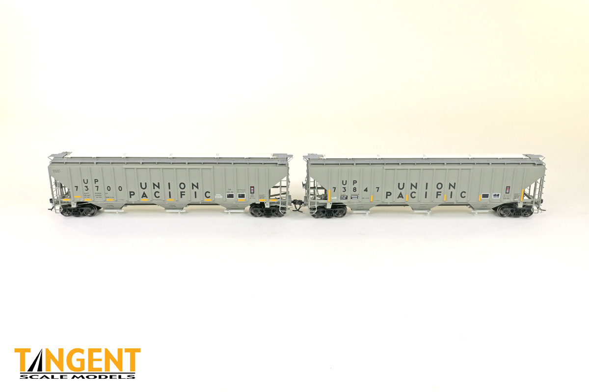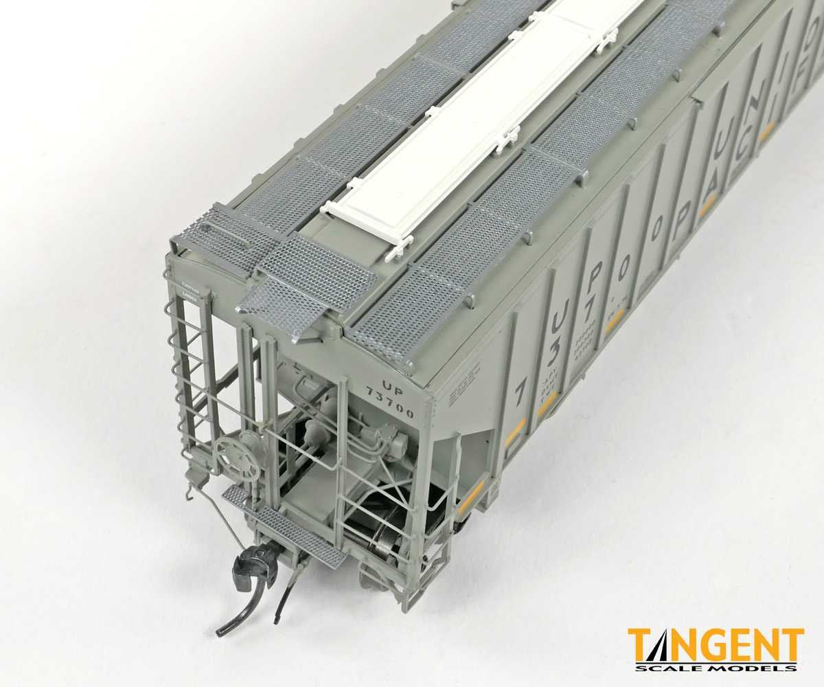 – UP “Delivery CH-100-28” With Conspicuity 2005+ offers “modern” modelers of the last 20 years two distinctive UP variations. We chose two specific numbers from the 1974 UP Pullman group and offer them in “Conspicuity Era” configuration. For SKU 36374-01, that translates to UP 73700, still wearing its Pullman delivery paint. The roof hatches have been swapped out to a smooth replacement style. The outlet gates have been replaced with modern bolt-on offerings. For SKU 36374-02, that translates to UP 73847, a UP Pocatello Idaho Shops repaint from 1977, with varying data, replacement roof hatches, and replacement modern outlet gates. Both Tangent models feature a correct Pullman combination closed-hole/open-hole body, weathered UP gray body color with conspicuity stripes added, faded warning stencils and yes, (different!) AEI tag parts mounted, per photos. The models come equipped with body-mounted brake hardware and our 100-ton Barber S-2 trucks with accurate “Hyatt” rotating caps.