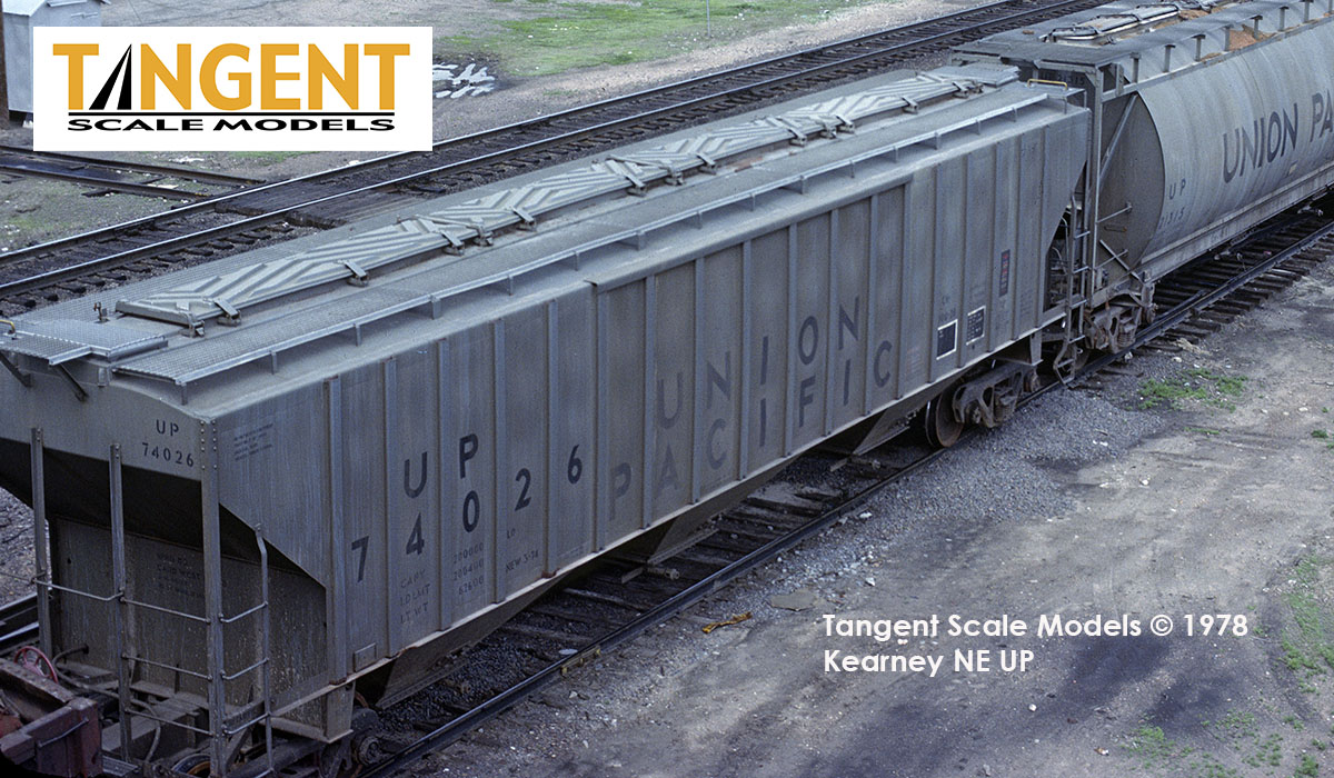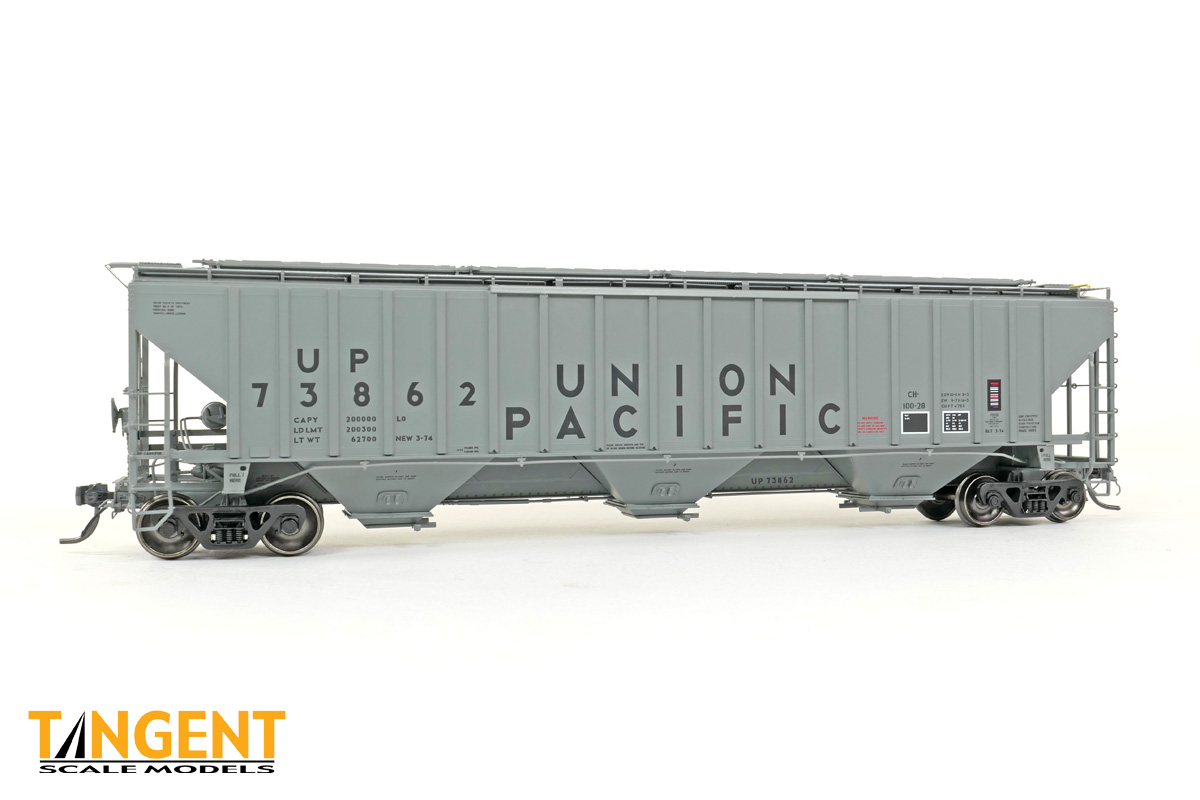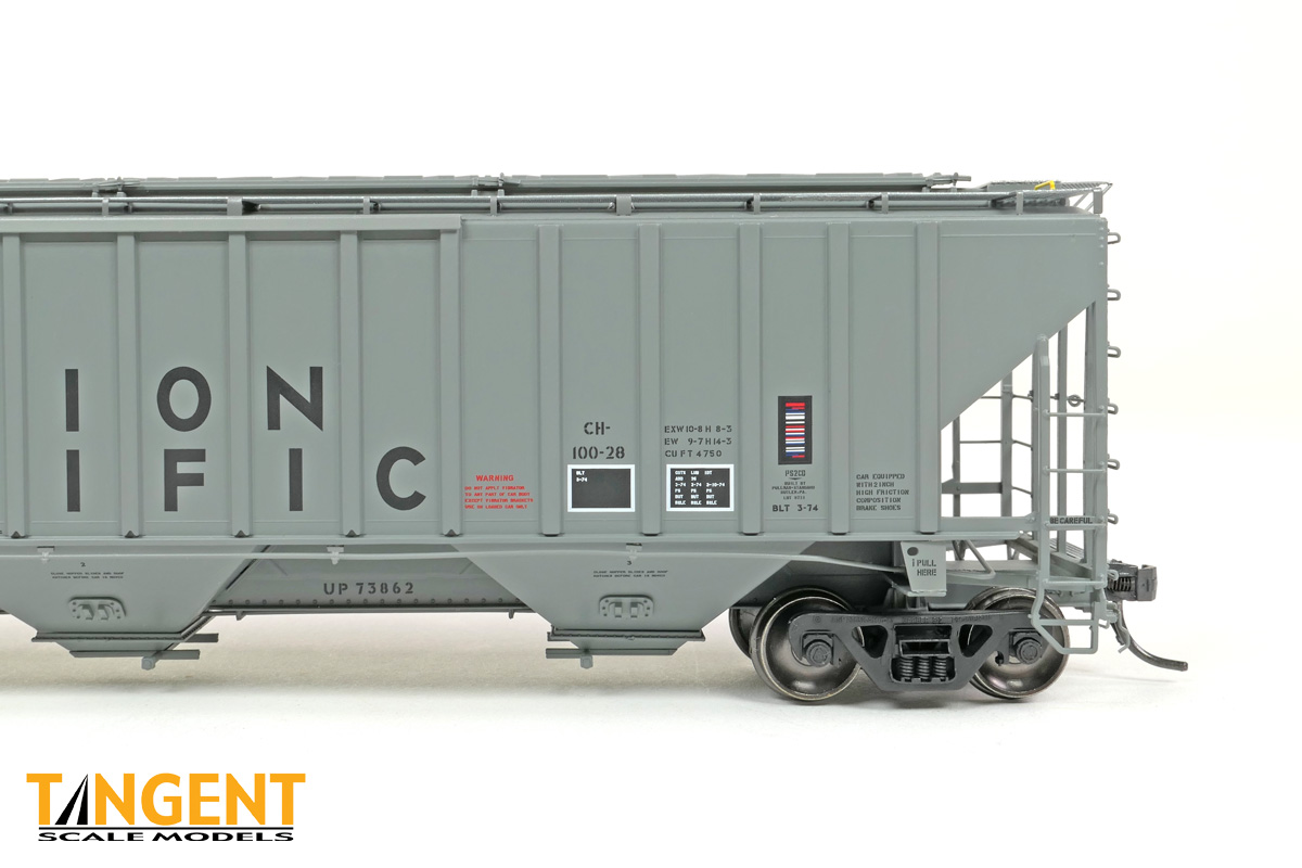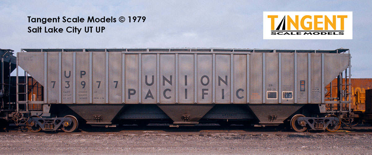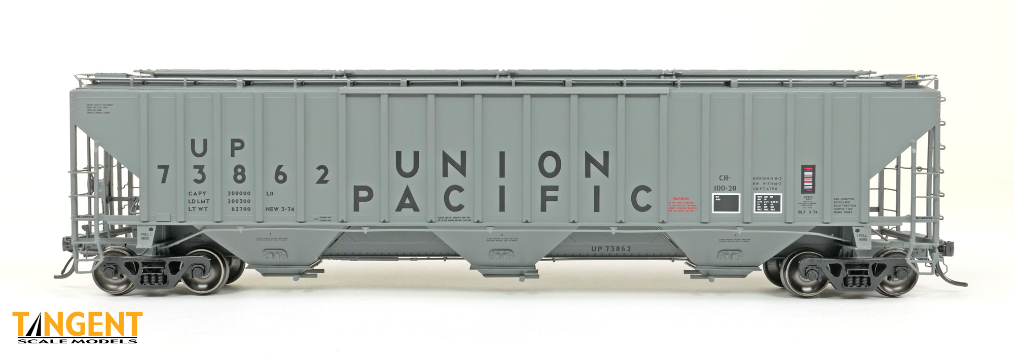 – UP “Delivery Gray CH-100-28” 3-1974 gives a big splash to UP fans. UP rostered eight groups of Pullman 4750s, and we chose the 1000-car order from lot 9721 for this release. This all-new Tangent 4750 body shell features the combination closed-hole/open-hole side posts found on some Pullman 1973/1974 production, along with UP specific corner steps and bolted outlet gate flanges. The roof of the car features another all-new piece of tooling: Landreth style roof hatches, with their distinctive zig-zag rib pattern. Check out those see-through Gypsum roof walkways and matching end crossover platforms. The models come equipped with body-mounted brake hardware and our 100-ton Barber S-2 trucks with accurate “Hyatt” rotating caps. Tangent’s UP paint and lettering is unmatched, created with care and accuracy down to the stencil marks are one-inch COTS panel lettering. Stay away from foobie 4750s!