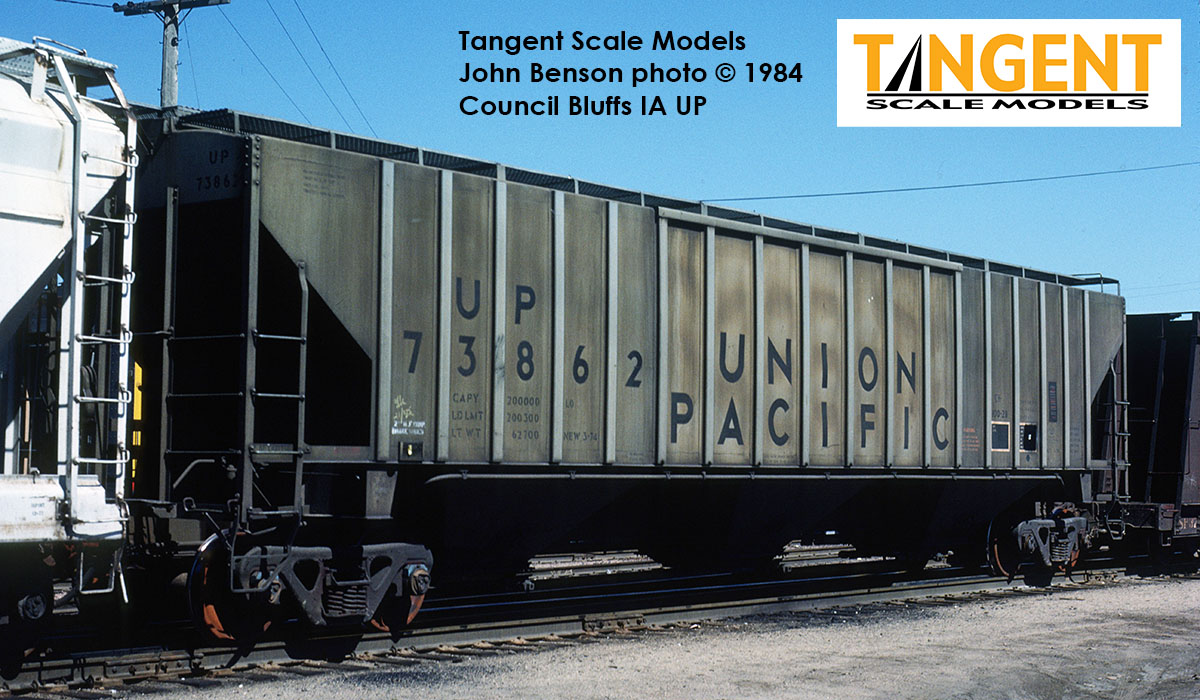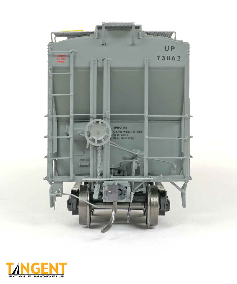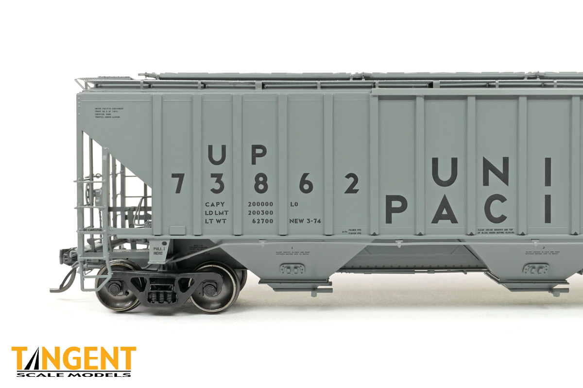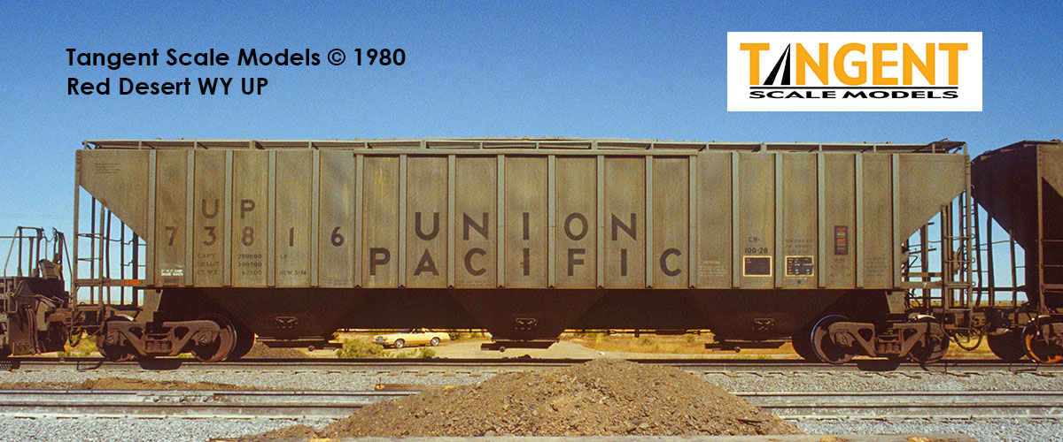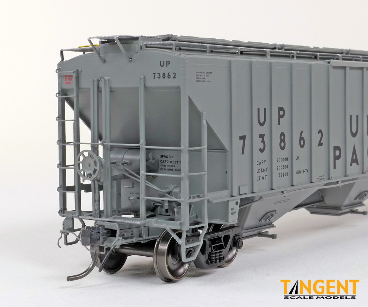 – UP “Delivery Gray CH-100-28” 3-1974 gives a big splash to UP fans. UP rostered eight groups of Pullman 4750s, and we chose the 1000-car order from lot 9721 for this release. This all-new Tangent 4750 body shell features the combination closed-hole/open-hole side posts found on some Pullman 1973/1974 production, along with UP specific corner steps and bolted outlet gate flanges. The roof of the car features another all-new piece of tooling: Landreth style roof hatches, with their distinctive zig-zag rib pattern. Check out those see-through Gypsum roof walkways and matching end crossover platforms. The models come equipped with body-mounted brake hardware and our 100-ton Barber S-2 trucks with accurate “Hyatt” rotating caps. Tangent’s UP paint and lettering is unmatched, created with care and accuracy down to the stencil marks are one-inch COTS panel lettering. Stay away from foobie 4750s!